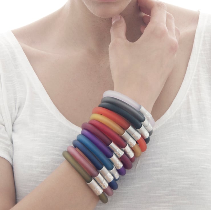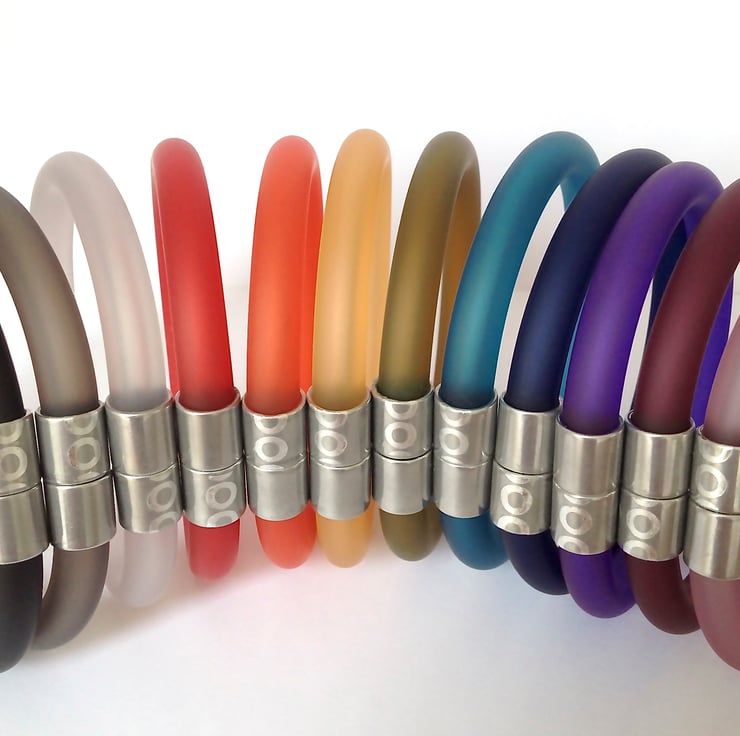 Click is collection of colourful magnetic jewellery designed for every day wear. The matt finish give these bangles a sophisticated timeless feel. The tubing is plastic (pvc) and is produced in a factory in Cornwall which I visit periodically to mix and sample the colours. The metal detail is aluminium.