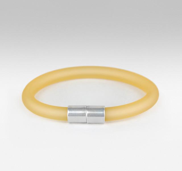 Click is collection of colourful magnetic jewellery designed for every day wear. The matt finish give these bangles a sophisticated timeless feel. The tubing is plastic (pvc) and is produced in a factory in Cornwall which I visit periodically to mix and sample the colours. The metal detail is aluminium.