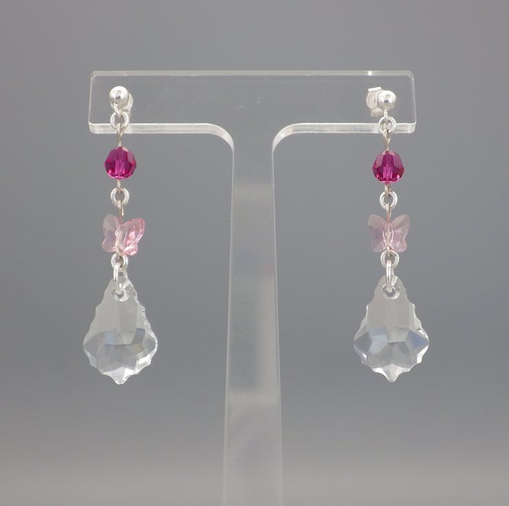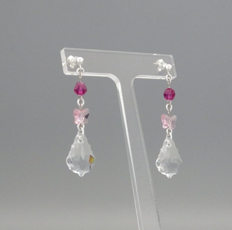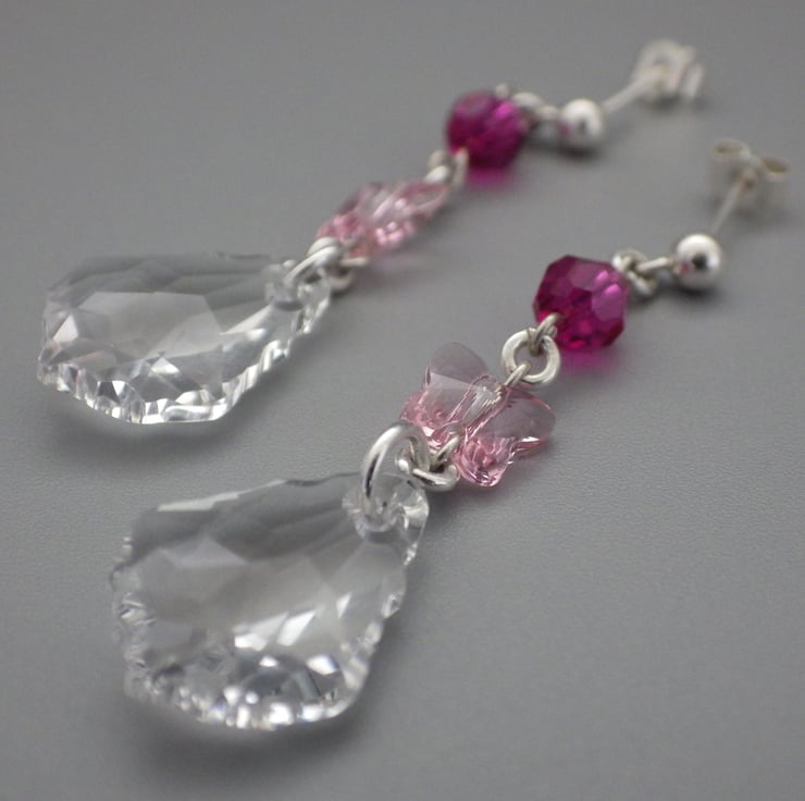 These earrings are made by me using gorgeous clear crystal baroque Swarovski beads. Teamed with round fuchsia pink and rose pink butterfly Swarovski beads, they are finished using Sterling Silver findings to form fabulous earrings. These earrings will lend a touch of elegance to your attire whenever you wear them!