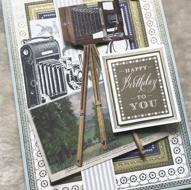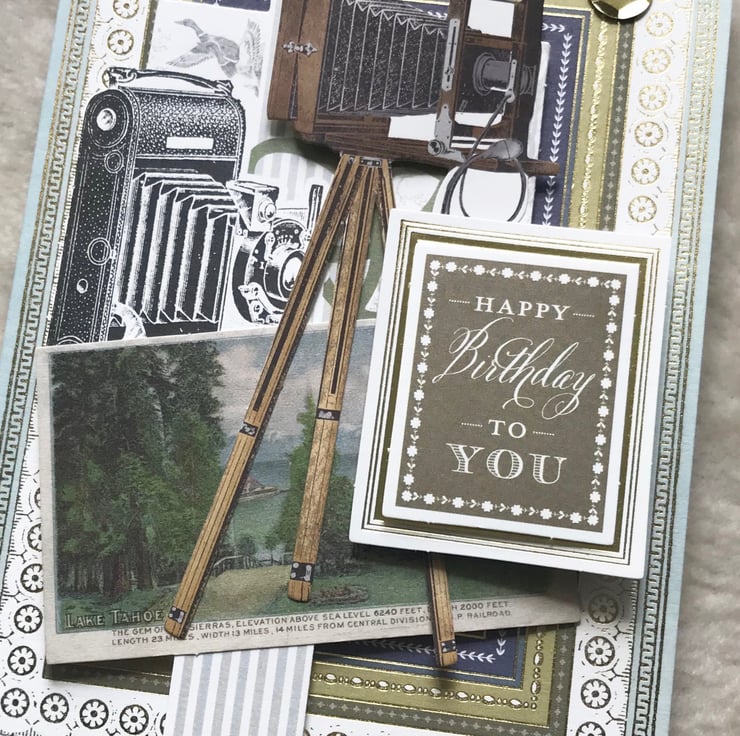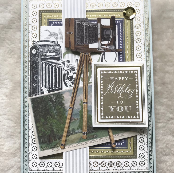 A vintage, 3D effect, collaged camera themed birthday card, handmade with Anna Griffin designer card stock. Embellished with co-ordinating, die-cut ephemera, with gold foiling, and sequin. Approx. 5"x7" in size, and inside includes the sentiment, 'Happy Birthday'.