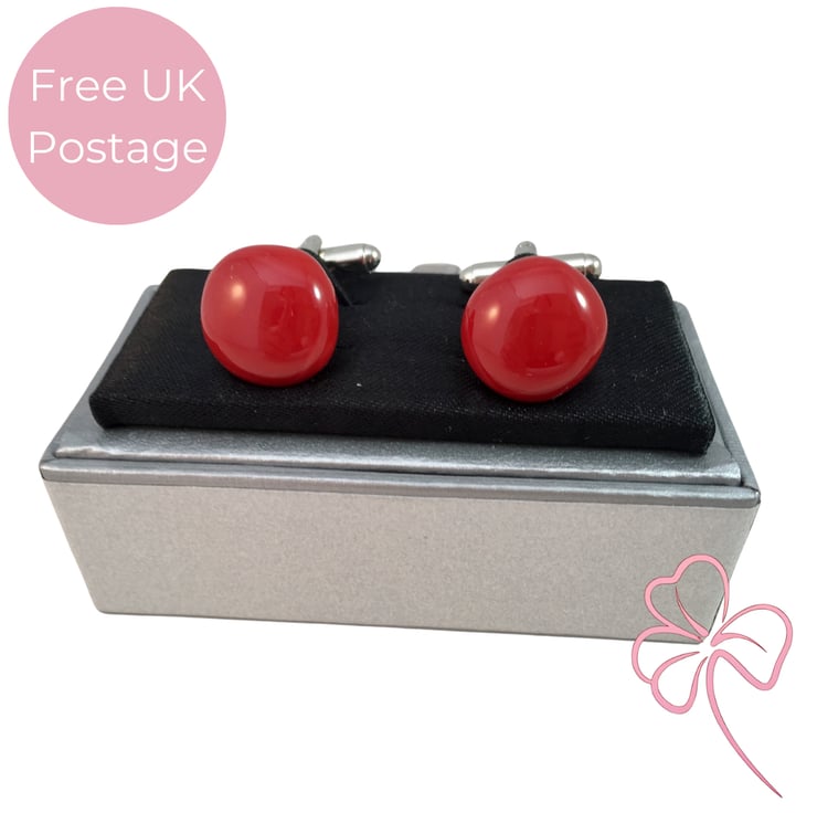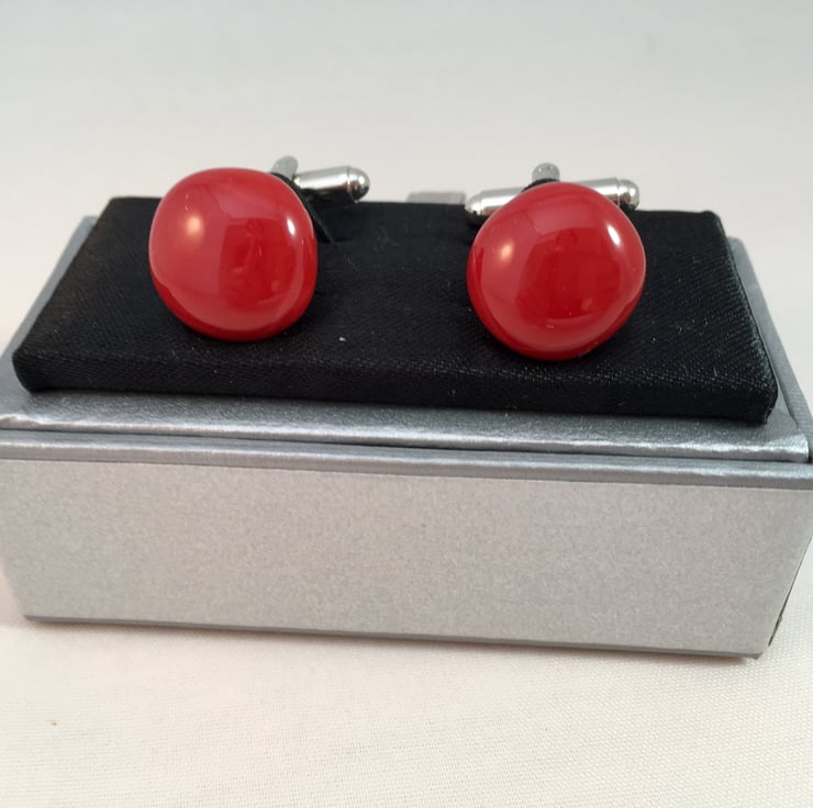 Two layers of red glass have been fused to 800 degrees Celsius to form these circular pebbles. They are fixed to silver plated cuff link bases and are presented in the display box pictured to make a lovely gift.