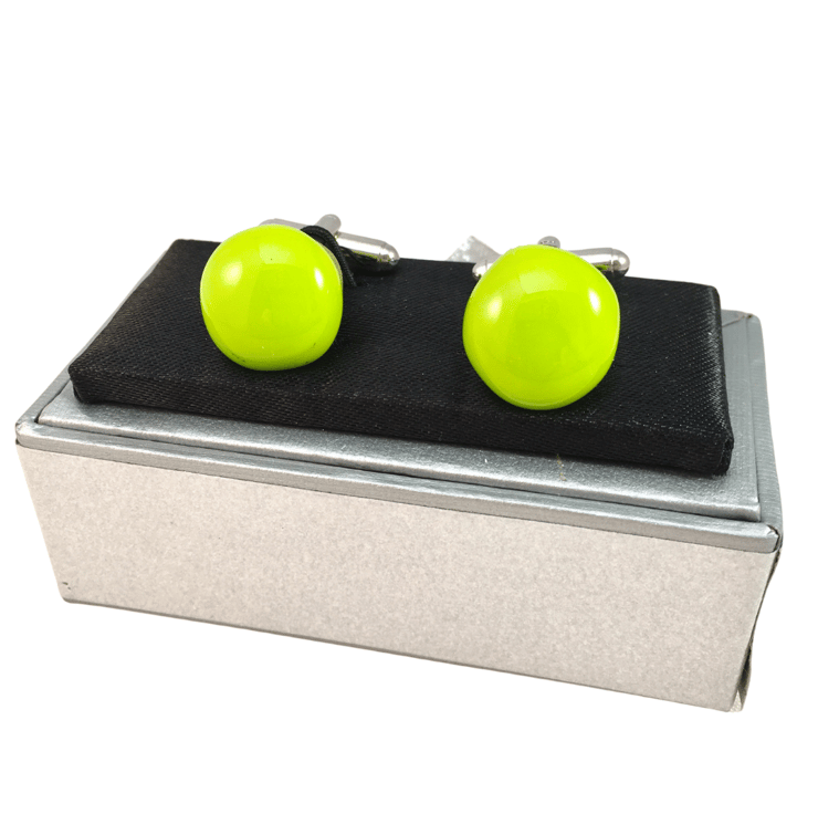 Two layers of spring green glass have been fused to 800 degrees Celsius to form these bright circular pebbles. They are fixed to silver plated cuff link bases and are presented in the display box pictured to make a lovely gift.