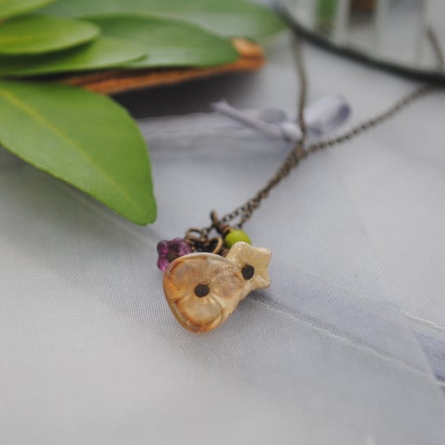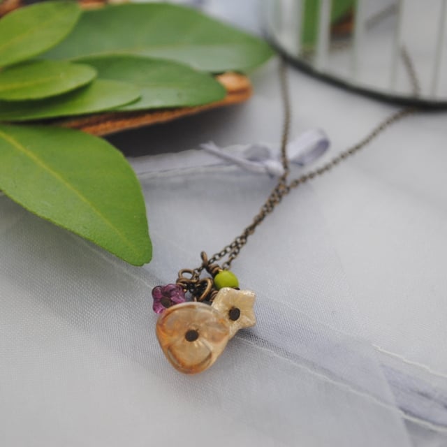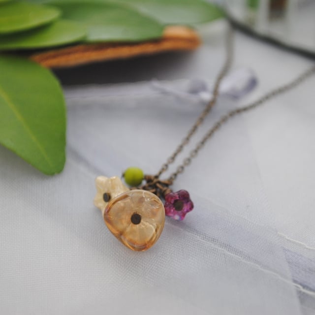 This necklace has a charm cascade made with flowers in complimentary shades. There is a larger flower in citrine (a gentle yellow amber shade), a lustre cream flower and a smaller contrasting violet flower. It also has an accent bead in chartreuse and this all hangs from a fine brass chain fastened with a matching lobster clasp.