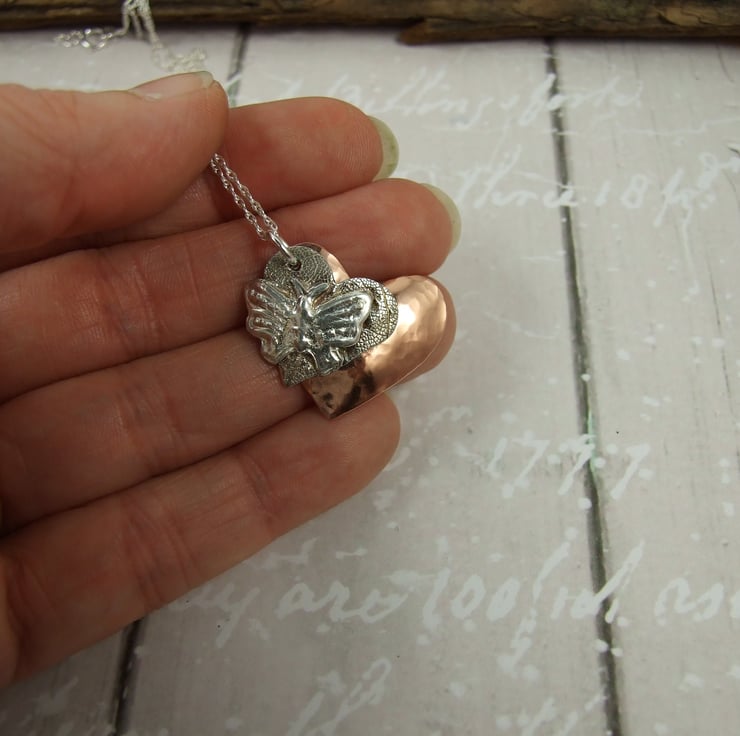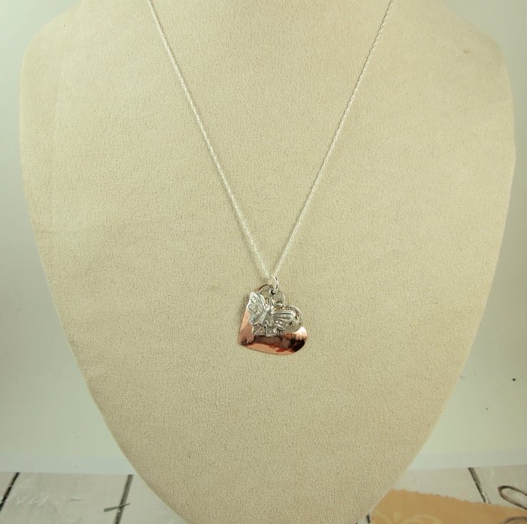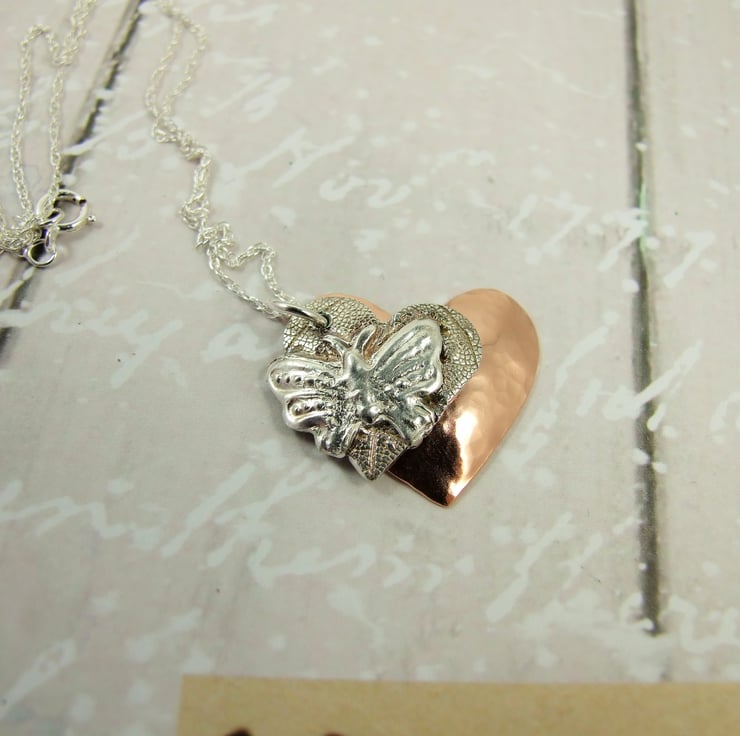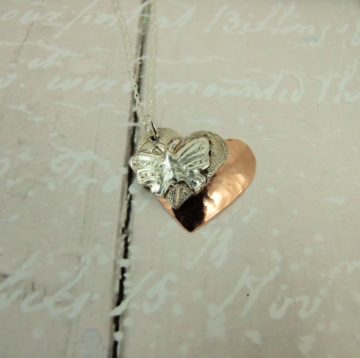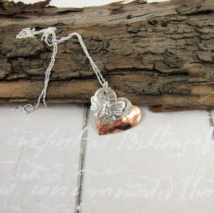 The silver heart pendant has been handmade from fine silver clay, embossed with a hand moulded little butterfly which I have then kiln fired. I have paired this with a hammered finish copper heart. Fitted to Sterling Silver Chain.