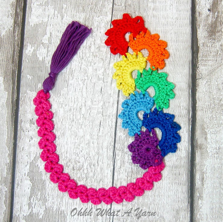 It has seven picot rainbows in the colours of the rainbow. It has a gorgeous hot pink crocheted cord with a purple handmade tassle.