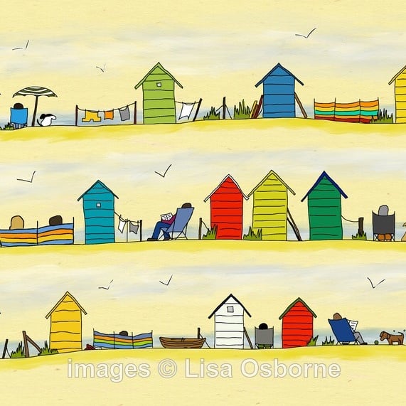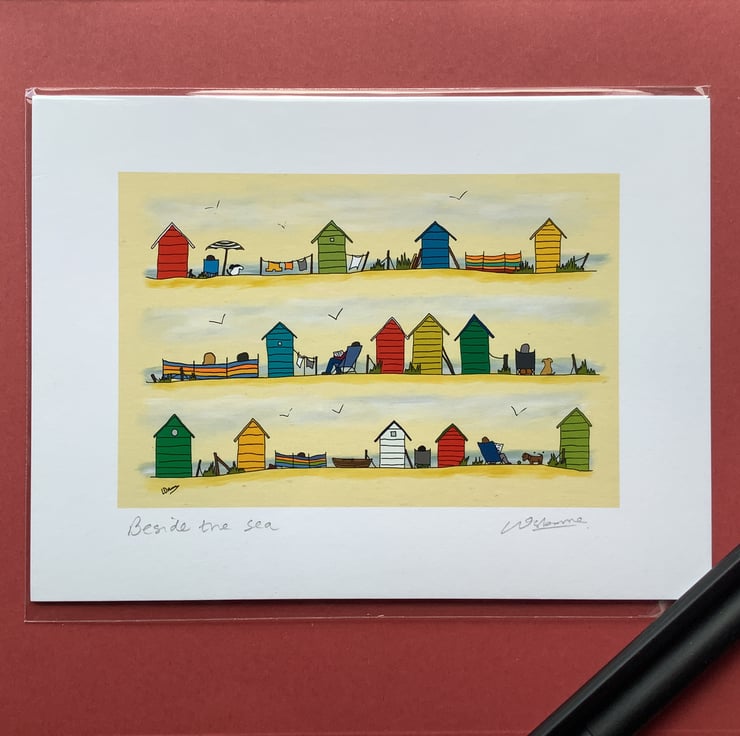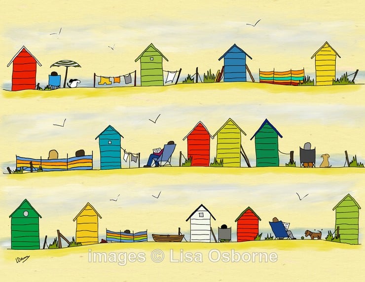 Beside the sea - high quality, open edition print of beach huts and people on the coast enjoying a day or holiday at the seaside.