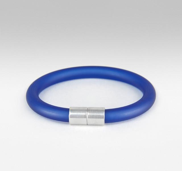 Click is collection of colourful magnetic jewellery designed for every day wear. The matt finish give these bangles a sophisticated, contemporary feel. The tubing is plastic (pvc) and is produced in a factory in Cornwall which I visit periodically to mix and sample the colours. The metal detail is aluminium. I call them 'Click' because of the sound they make when they close.
