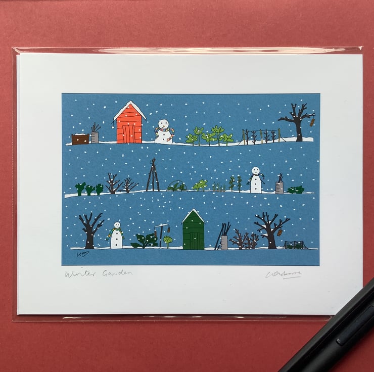 Signed and titled and presented with a sturdy card backboard and a clear biodegradable, compostable sleeve.
