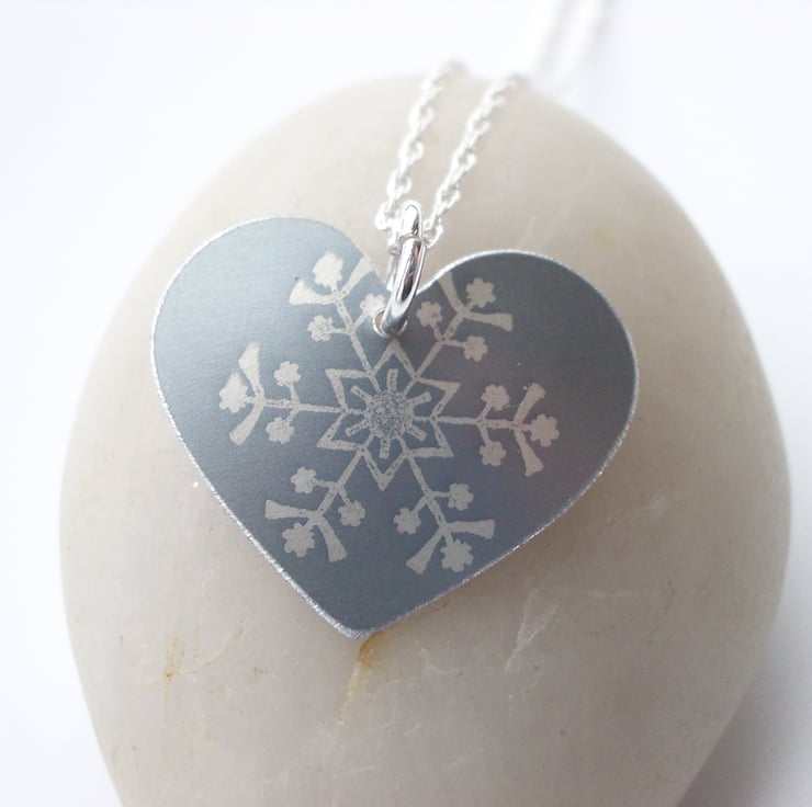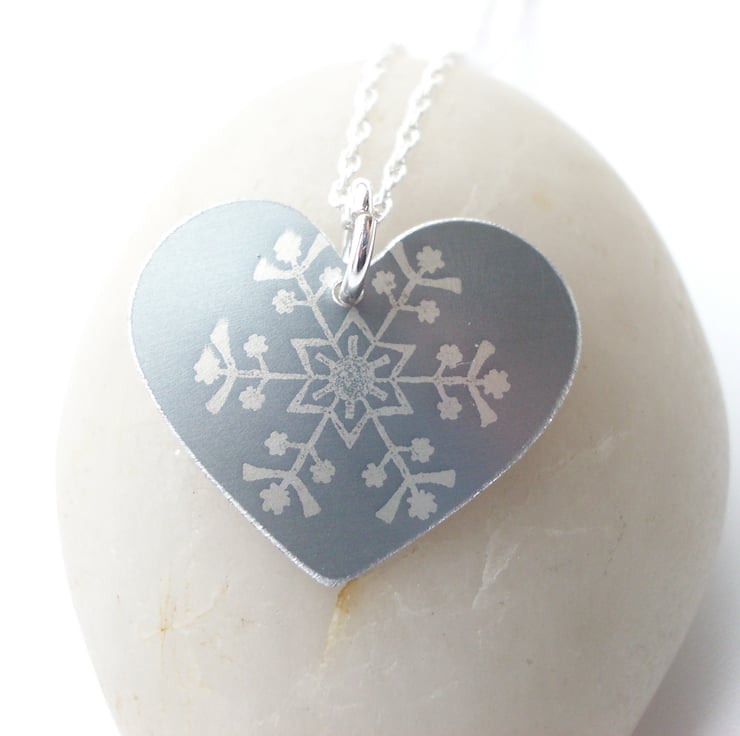 This silver grey coloured heart pendant is hand crafted from aluminium, which I have dyed, printed with a silver snowflake and sealed so that the dye becomes a permanent part of the metal. I have saw pierced by hand the heart shape and have then domed the heart so that it catches the light.