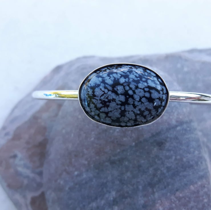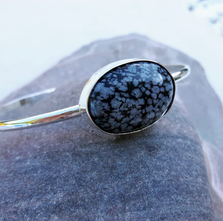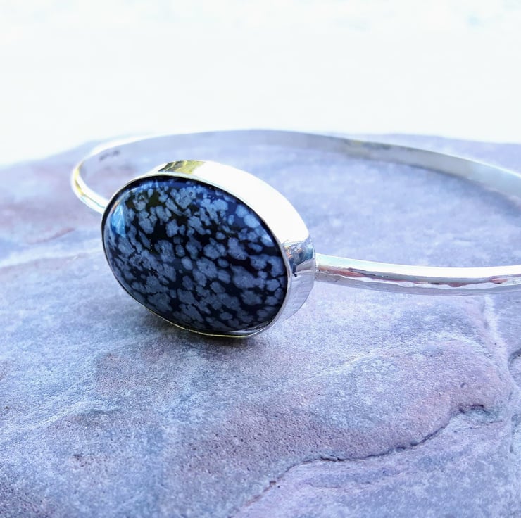 This beautiful sterling silver bangle features a stunning oval cabochon of black and white snowflake Obsidian. The bangle has been created from a sturdy D-profile Silver wire, lightly hammered to add texture and formed into an oval shape that sits comfortably on the wrist. It will fit a medium-sized wrist or smaller. The stone is a large oval cabochon evoking a snowstorm against a dark background. It is mounted in a sterling silver bezel setting with an open back. Traditional silver hallmarks, including my own unique maker’s mark, have been applied by the London Assay Office. The bangle will be packaged in a smart gift box or organza bag and sent to you by Royal Mail signed for delivery in the U.K. or by their Guaranteed Delivery service elsewhere.