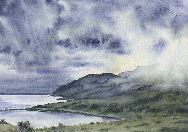 This print is reproduced by me from a scan of an original watercolour painting created in April 2018, titled "Clouds Descend on Ben Hiant at Sundown - Camus nan Geall, Ardnamurchan".