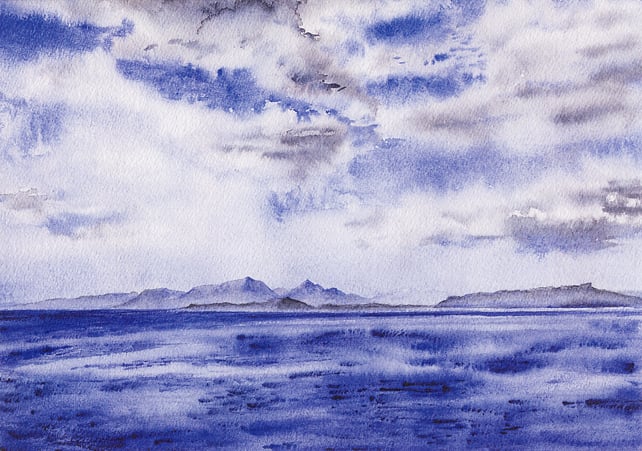 This image shows the wonderful view of the Small Isles - the Inner Hebridean islands of Rum, Eigg and Muck - across the Sea of the Hebrides from the rocks at Ardnamurchan lighthouse, the most westerly point on the British mainland. Out at the lighthouse in late May, everything was blue except for the clouds: blue sky, blue sea and blue islands. The weather was fine but rather hazy, and at times white or even grey clouds blocked the sun, but the scene remained strikingly blue though the hues shifted as the clouds passed by. As the wind was too cold to remain on the rocks long enough to sketch, I took a set of photos to work from and started work on this image that same evening.