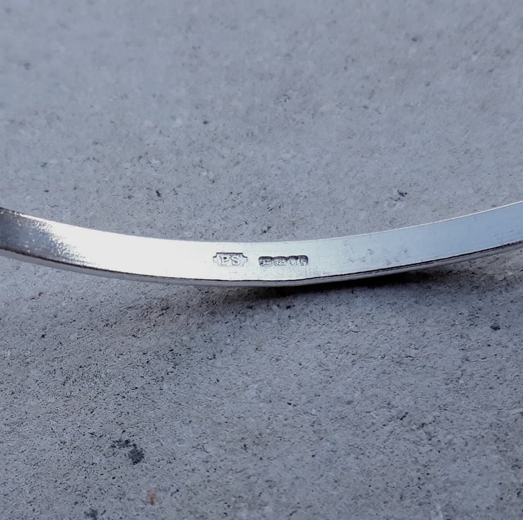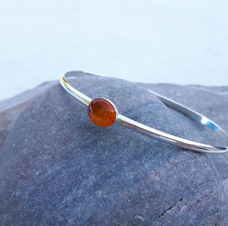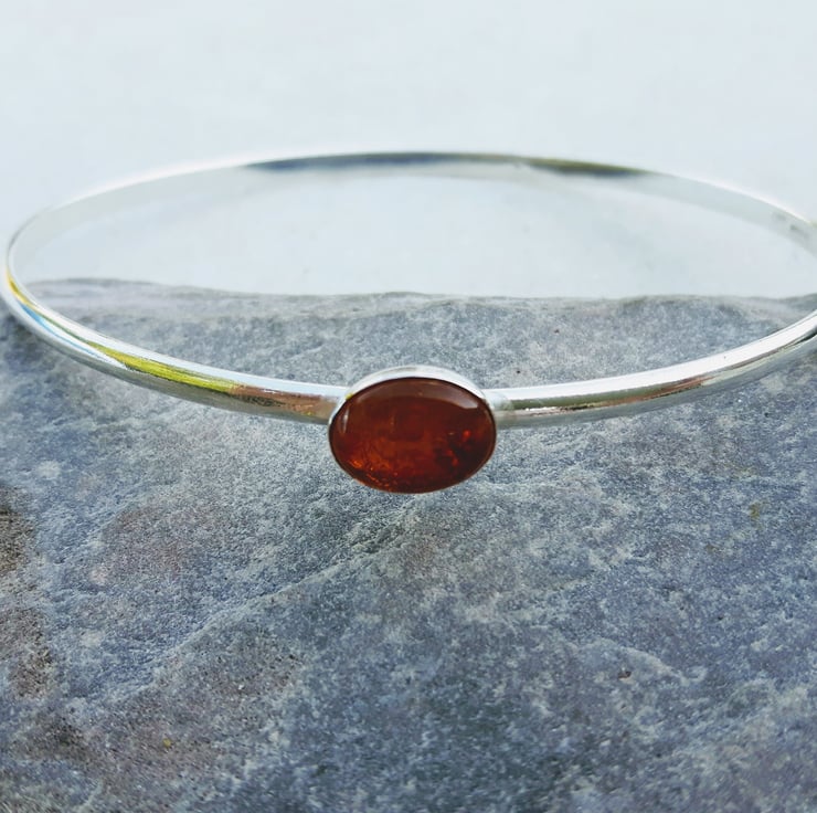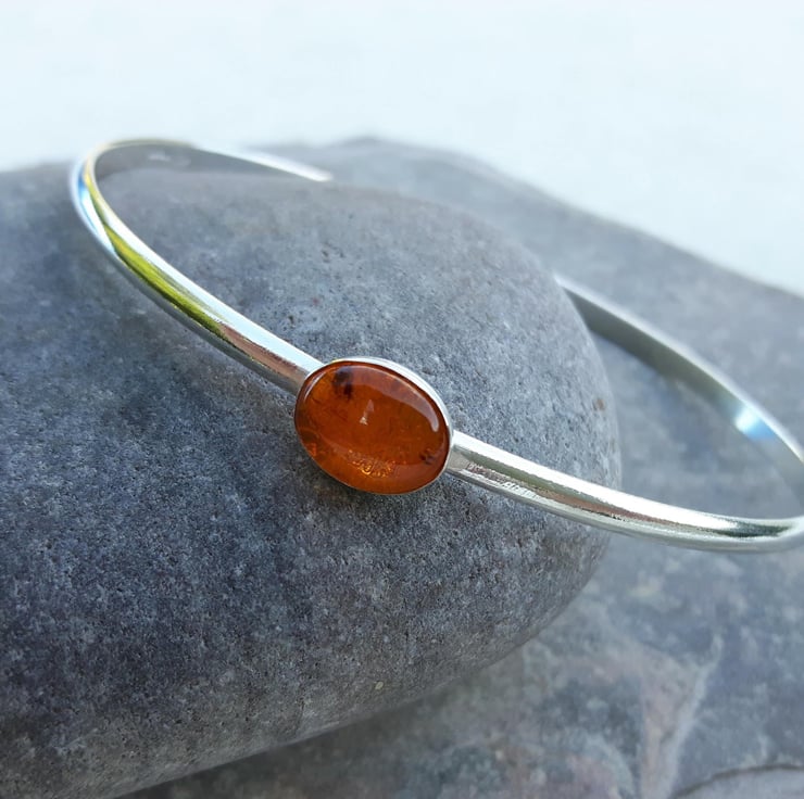 This lovely sterling silver bangle has been made from chunky sterling silver D-wire. It is a medium size and features an oval cabochon of glowing natural amber set in a silver bezel cup. The amber contains traces of ancient inclusions. The silver has been tumble-polished to a high shine and traditional silver hallmarks, including my own unique maker’s mark, have been applied by the London Assay Office. The bangle will be packaged securely in a gift box or pretty organza bag and sent to you by Royal Mail signed-for delivery in the UK or by their Guaranteed Delivery service in other countries.