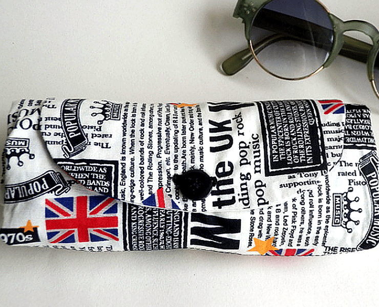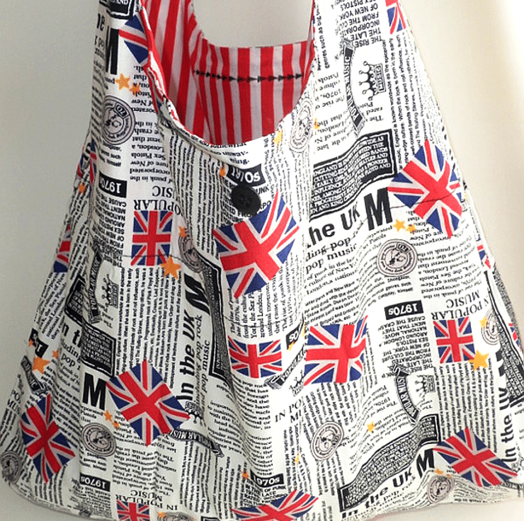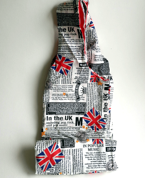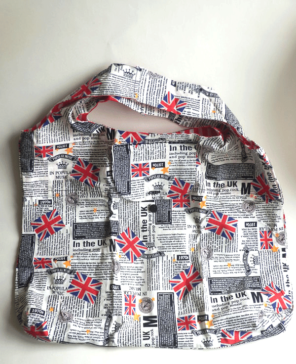 This is a brand new, handmade, folding shopping bag. An essential in these recycling times! The cotton fabric has black newspaper print on a white background, with paragraphs on the rise of Punk music in Britain in the 1970’s. Interspersed with the text are Union Flags & yellow stars. It is partly reinforced inside using a red & white striped fabric. The bag has an edgy look & feel.