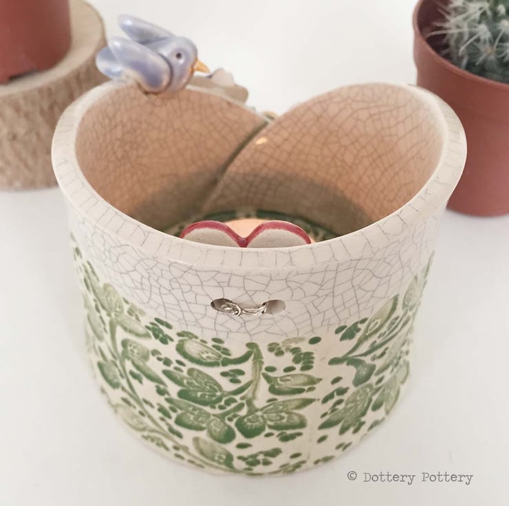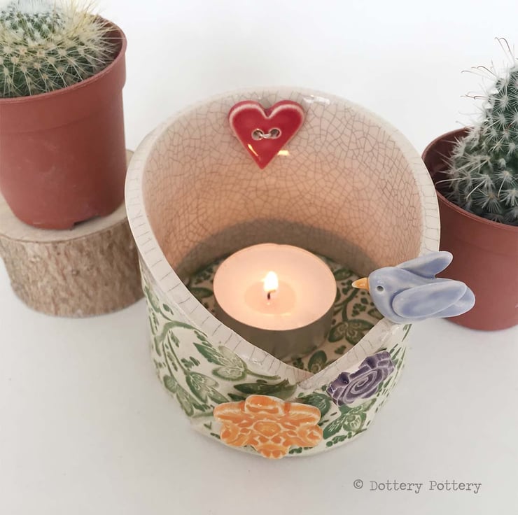 This decorative little candle holder is made from white earthenware clay.It is decorated with a leaf and floral pattern with a little bird perched on the rim and then fired once. It is then glazed with a vintage style crackle glaze and fired again to a top temperature of 1100 degrees, so it is nice and strong. Perfect as a tealight holder or little trinket dish. It is not suitable for holding liquids because the crackle glaze is not water tight. It measures 7cm high by 9cm diameter