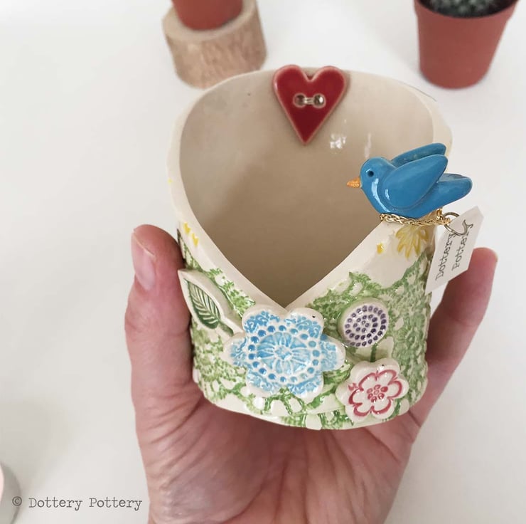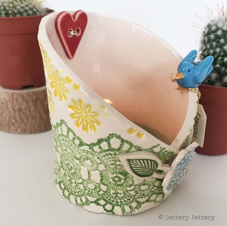 This decorative little candle holder is made from white earthenware clay.It is decorated with a leaf and floral pattern with a little bird perched on the rim and then fired once. It is then glazed with a clear glaze and fired again to a top temperature of 1100 degrees, so it is nice and strong. Perfect as a tealight holder or little trinket dish. It measures 9cm high by 9cm diameter