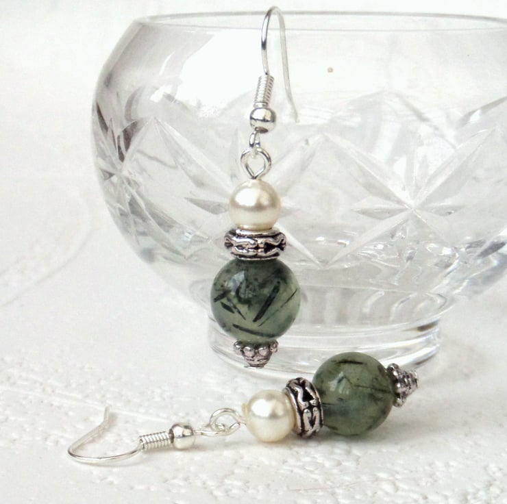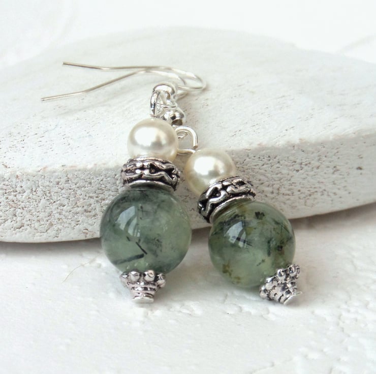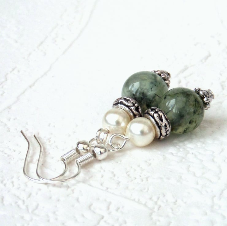 I have made them with a 10 mm prehnite gemstone and a small crystal pearl, separated by a Tibetan silver coloured band. The earrings have been completed with a silver coloured bead cap at the base.