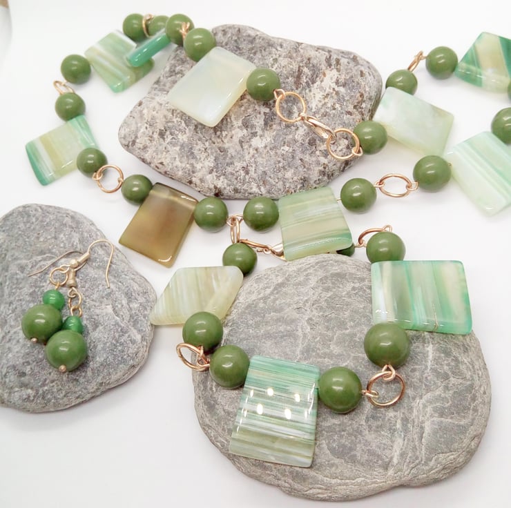 Green Jade and Glass Trapezoid Shaped Bead 3 Piece Jewellery Set