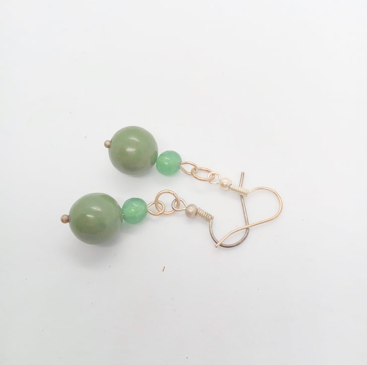This very attractive jewellery set is made using green 12 mm round jade beads and 25 mm x 20 mm glass trapezoid beads joined together by silver plated jump rings. The clasps on the necklace and bracelet are silver plated lobster clasps and the hook ear wires are silver plated as well.
