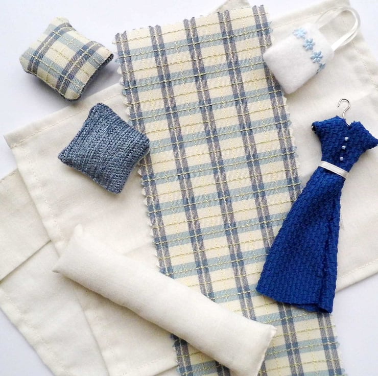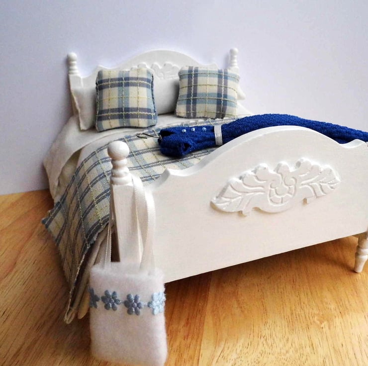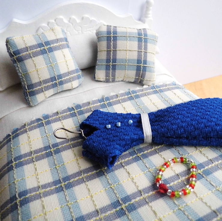 A lovely item to add to your dolls house bedroom scheme. The soft cream cotton sheets and blue checkered scatter cushions & throw would suit most bedroom interiors.