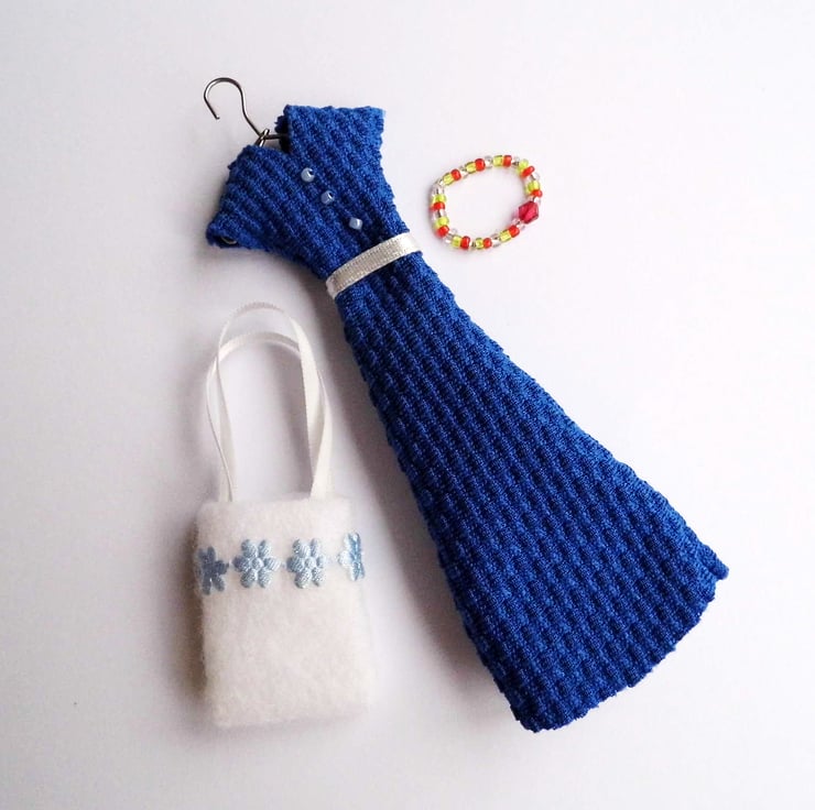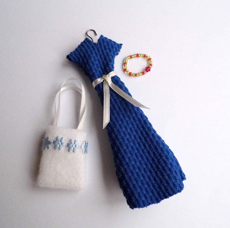 1 x Blue dress with seed bead buttons on a metal coat hanger ( which can be removed, but the dress is for decoration purposes only) Dress Length - 11cm (4.25")