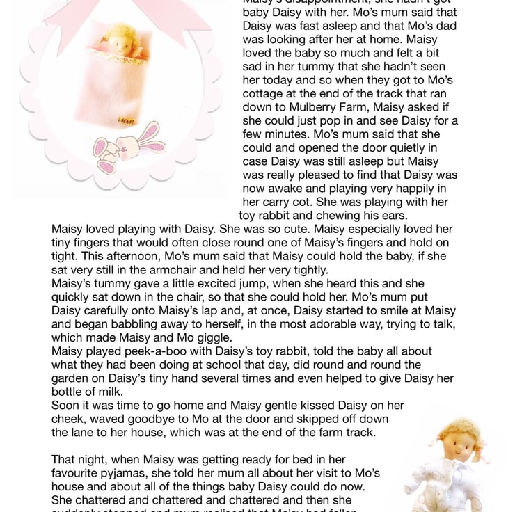There are other children in Maisy’s class at Mulberry Green Infants’School - Violet, Billy, Amber, Rose, Ruby, Marigold, Tilly, Amelia and twins Oliver and Olivia. The children are all 28cm tall, Baby Daisy is 16cm and Molly the dog is just 8cm. Maisy and Mo love nothing more than having adventures with their friends.