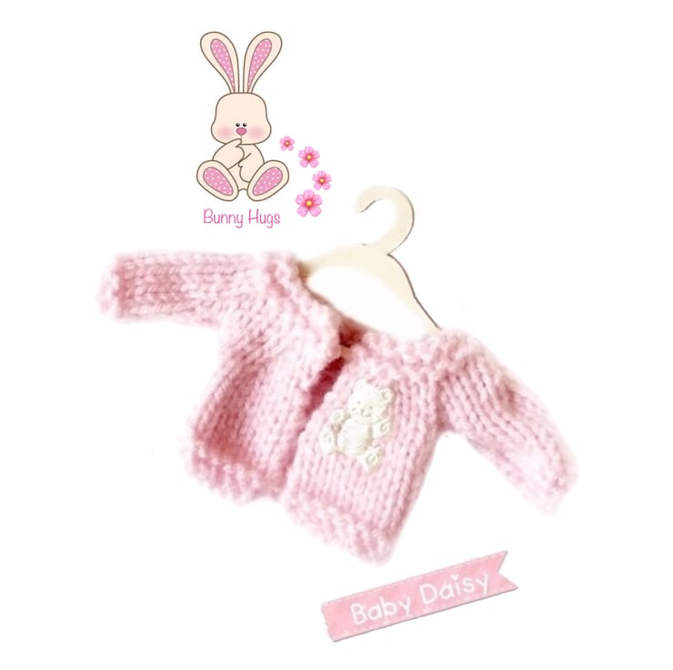 A sweet little pink cardigan made especially to fit baby Daisy. The cardigan is decorated with a tiny cream satin teddy bear and comes on a cute little wooden hanger.