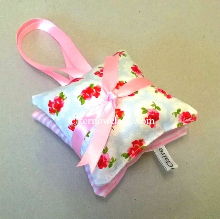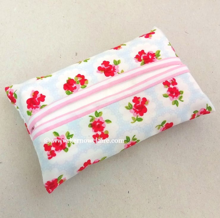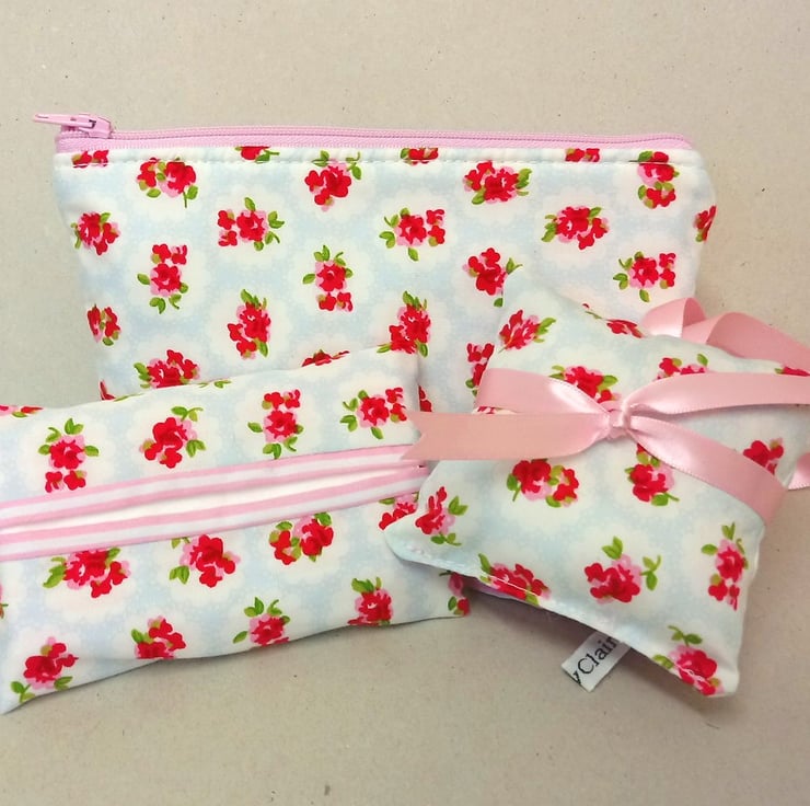 Each item is handmade in a pale blue cotton fabric with pink flowers