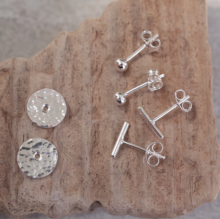 This clever little silver earring set gives you a choice of 4 different ways to wear the earrings. The set consists of a pair of 3mm dot stud earrings, a pair of 9mm long dash studs and a pair of 9mm diameter hammered silver discs.