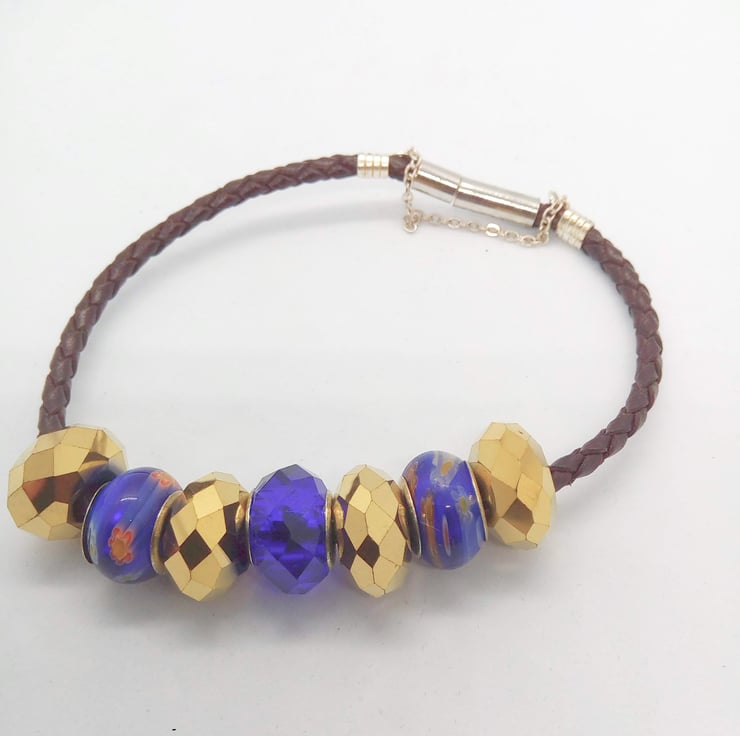 The bracelet is made using 15 mm x 8 mm gold faceted lampwork beads two 15 mm x 10 mm blue glass lampwork beads and one 15 mm x 10 mm faceted cobalt blue lampwork bead all threaded onto a black plated leather Bracelet. A silver plated chain safety chain had also been included for extra security. The Bracelet is 17.5 cm in circumference and has a silver plated bayonet style clasp.