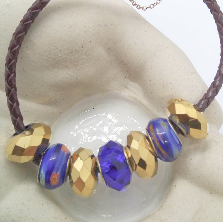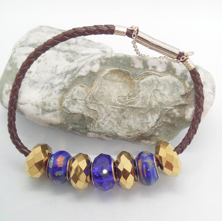 Blue and Gold European Lampwork Bead Bracelet on a Black Plaited Leather Band