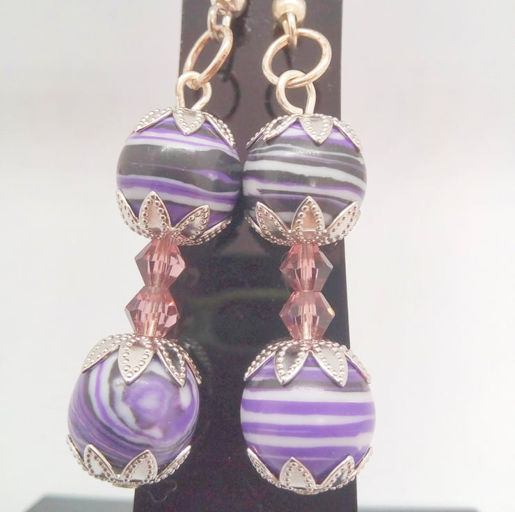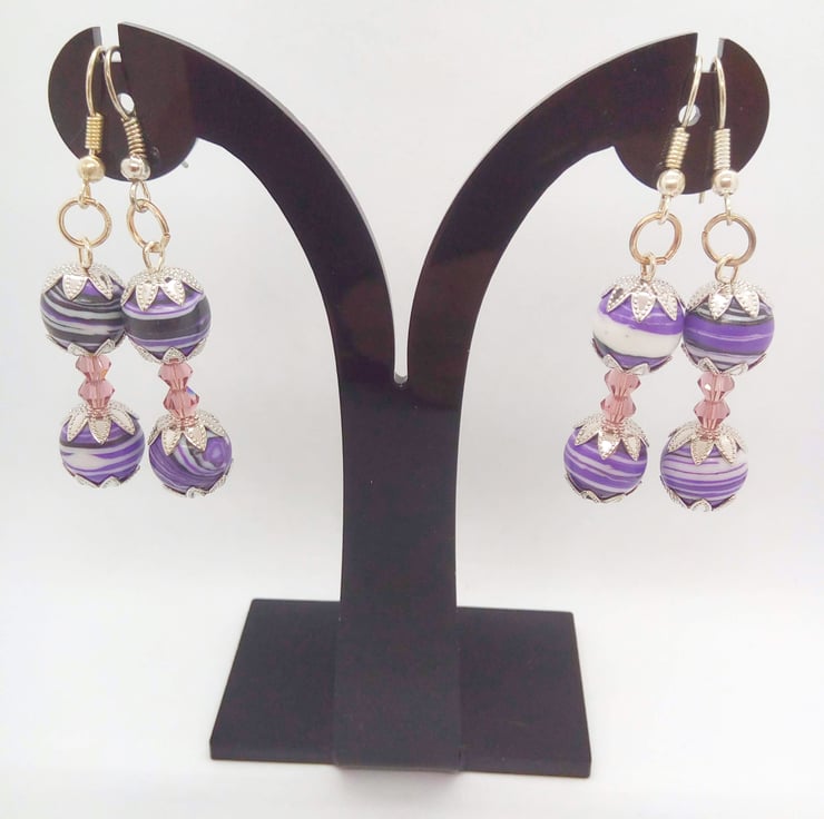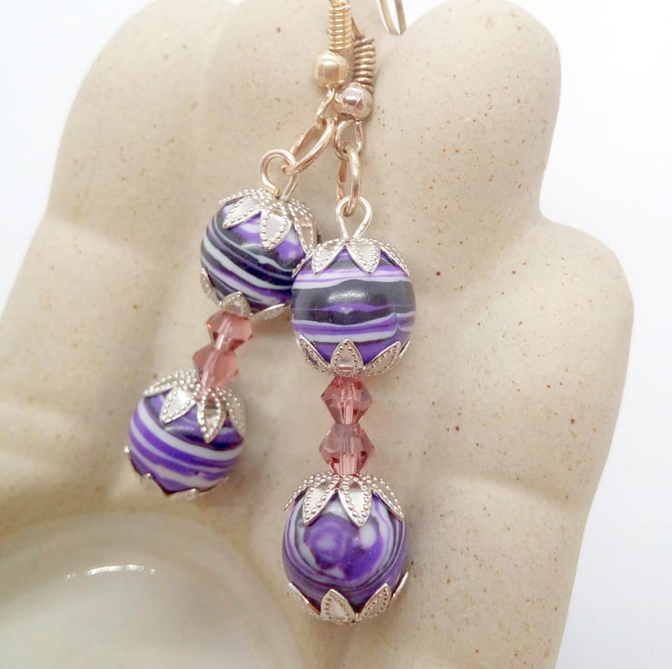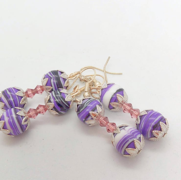 The earrings are made using 10 mm Purple Agate beads and 2 x 4 mm purple bicone beads at the center with silver plated bead caps, hung on silver plated ear hooks and they have a drop of 3.5 cm.