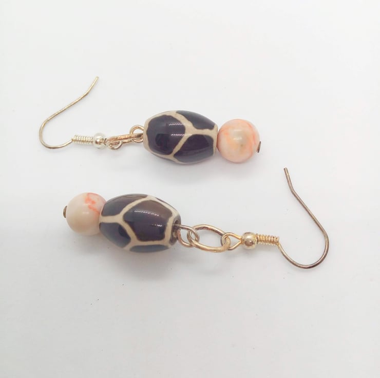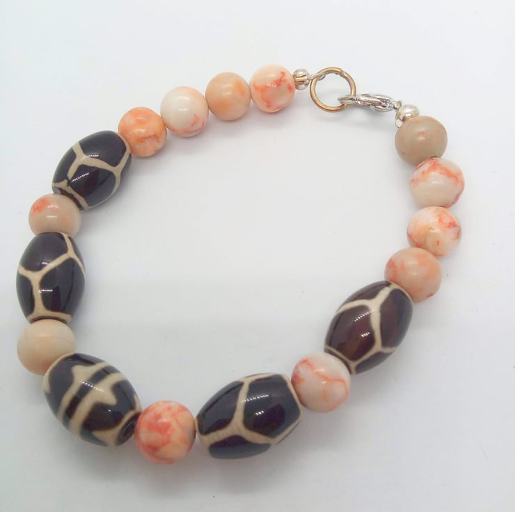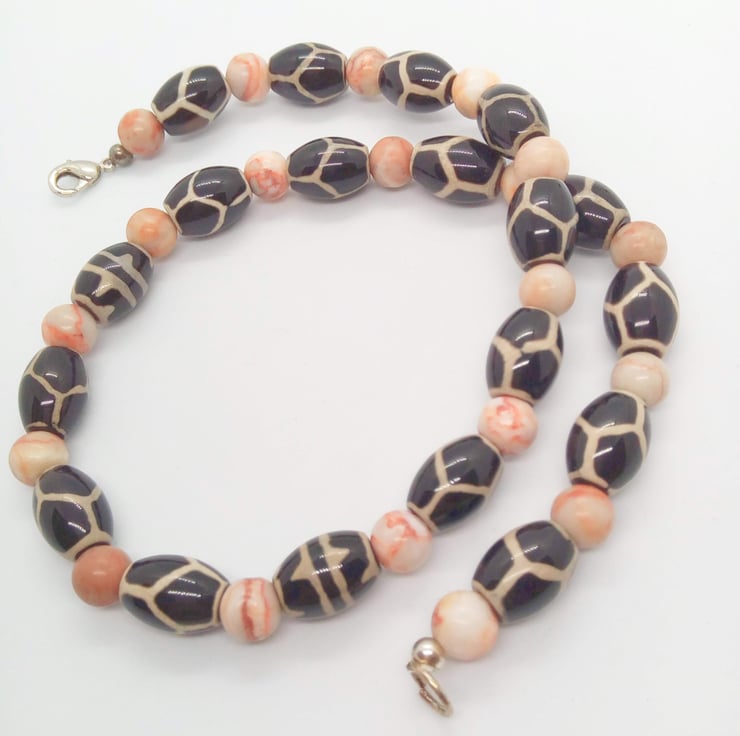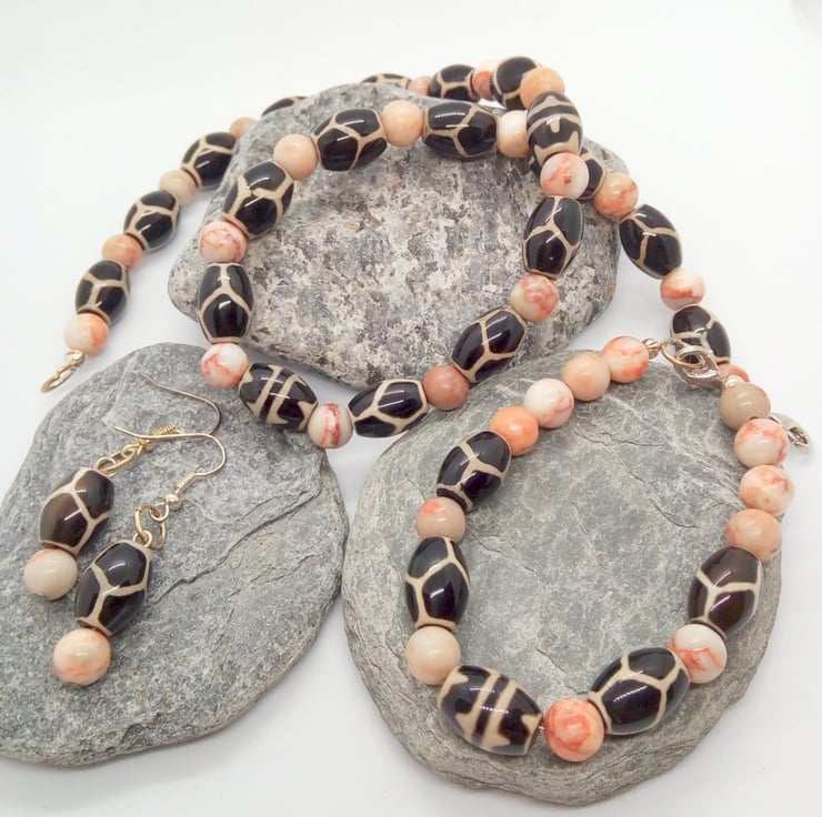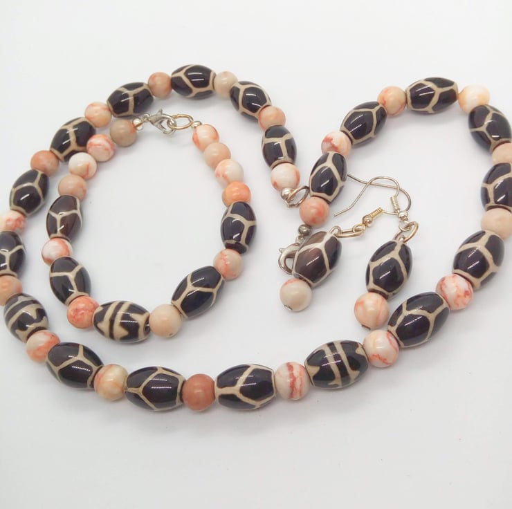 This gorgeous jewellery set is made using 15 mm x 10 mm oval tribal beads with a giraffe skin pattern, and 8 mm pale pink spider jasper beads. The earrings have silver plated ear wires, the necklace and bracelet have a silver plated lobster clasp.