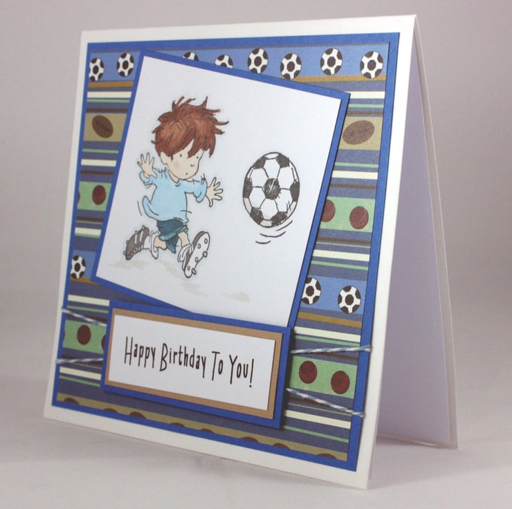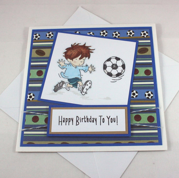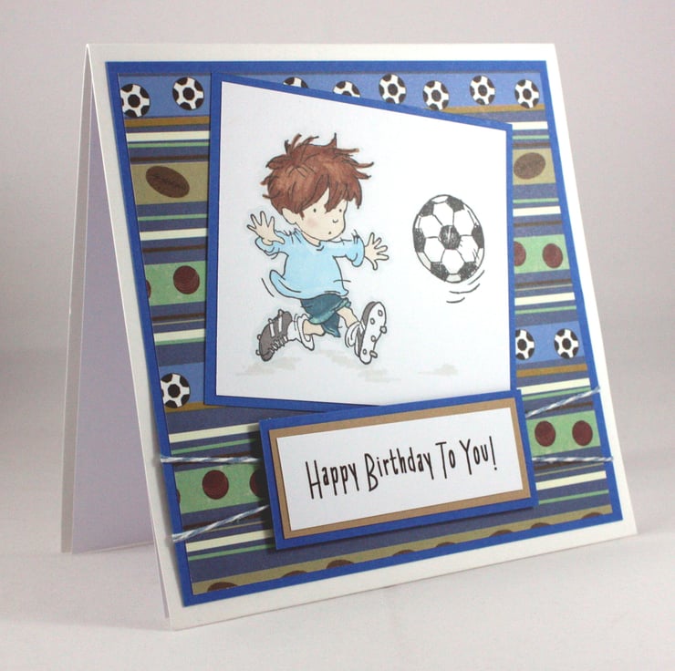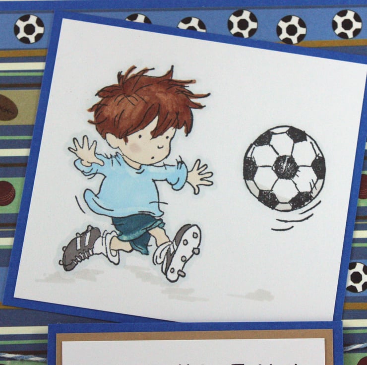 Square birthday card featuring a hand stamped and coloured image of a little boy playing football. The image is overlaid onto a sports themed background showing footballs, rugby balls and cricket balls.