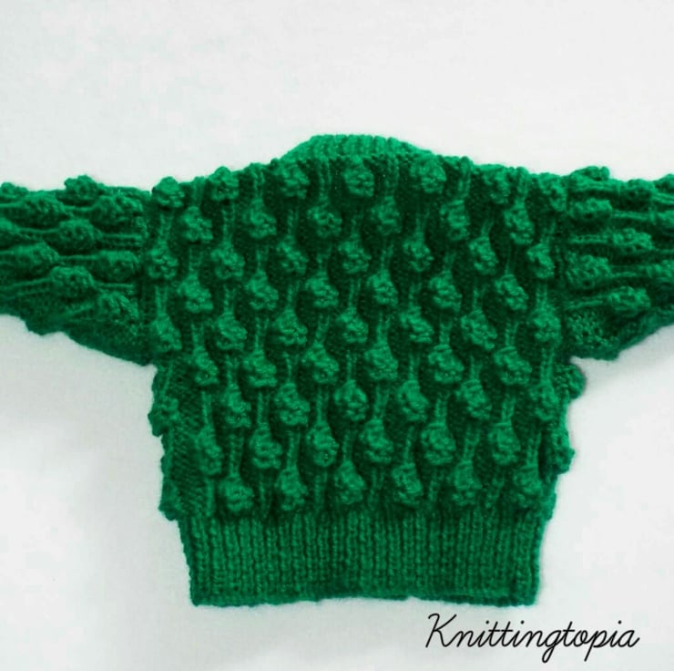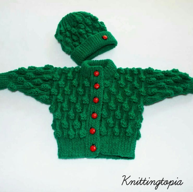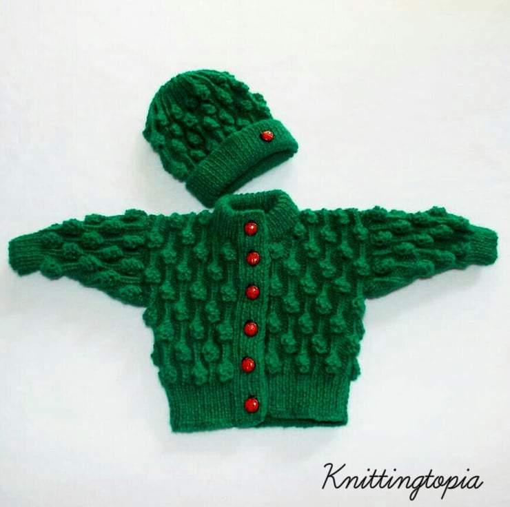 Hand knitted baby green bobble cardigan and matching hat 0 - 6 months