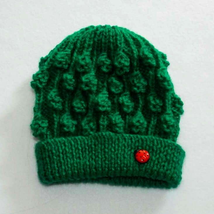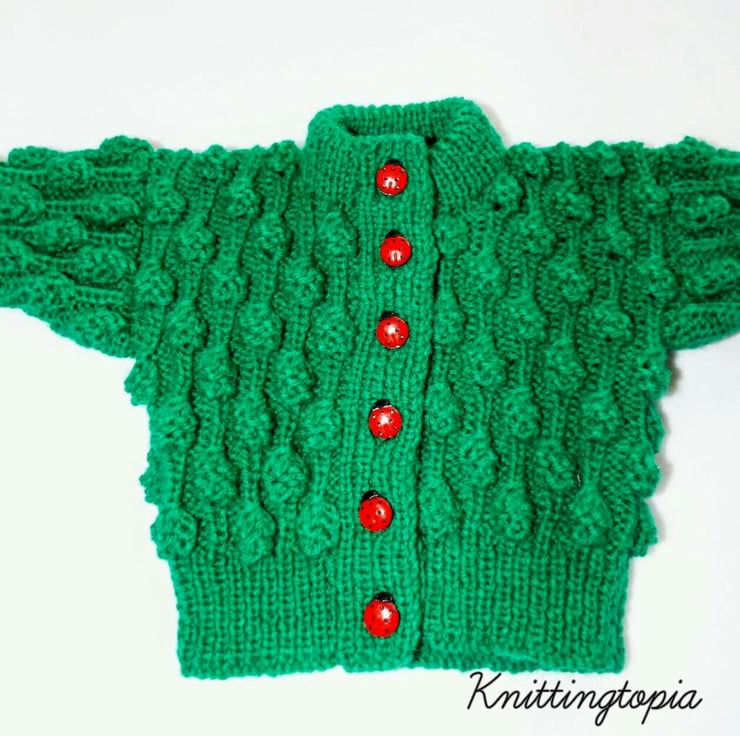 This hand knitted baby cardigan and hat has been knitted in emerald green. The cardigan has an all over textured bobble pattern, long sleeves and a round neckline. To fasten it i have used ladybug buttons which look lovely on the green. The hat is knitted in the same bobble pattern and one of those sneaky ladybugs has made it's way onto the brim so it matches lovely with the cardigan.