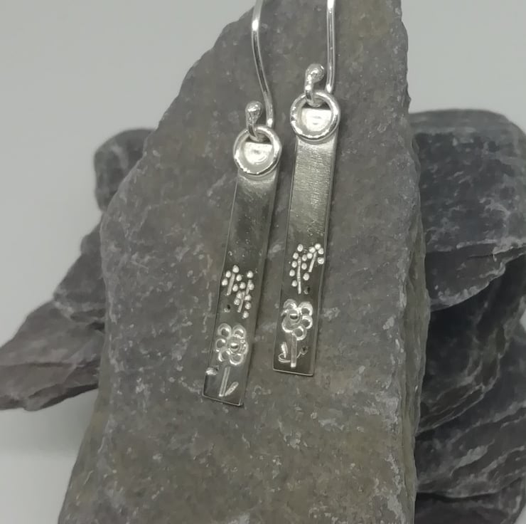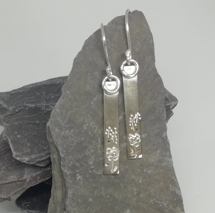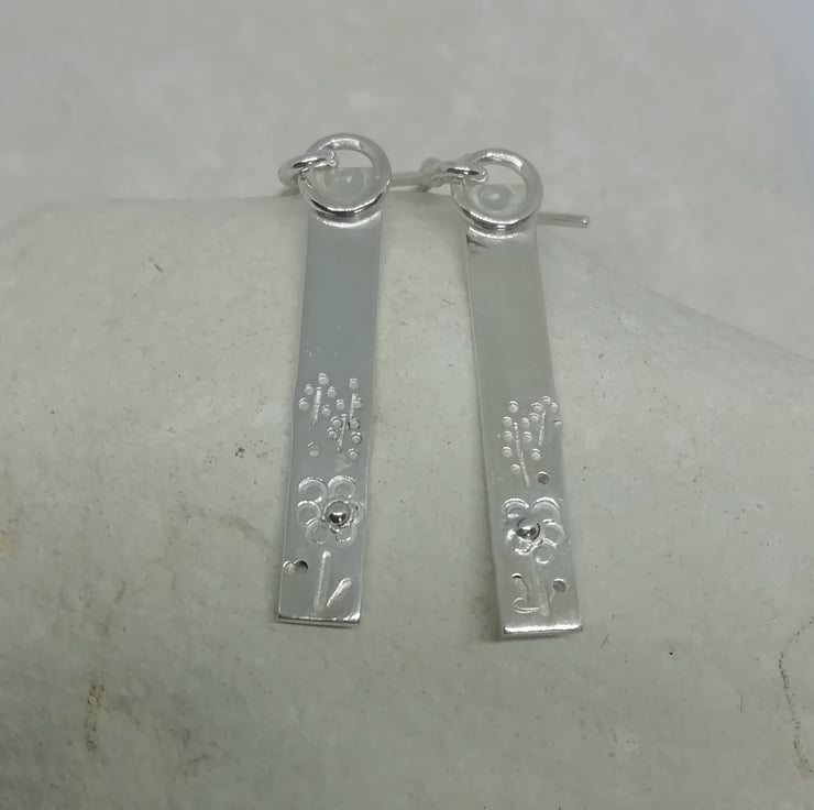 A wayside scene of flowers and grasses are stamped into these 2 rectangles. A flattened ring at the top attaches them to ear wires. They are 25 mm long and 4 mm wide.