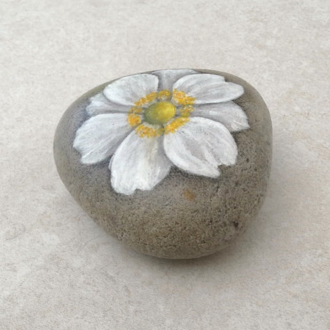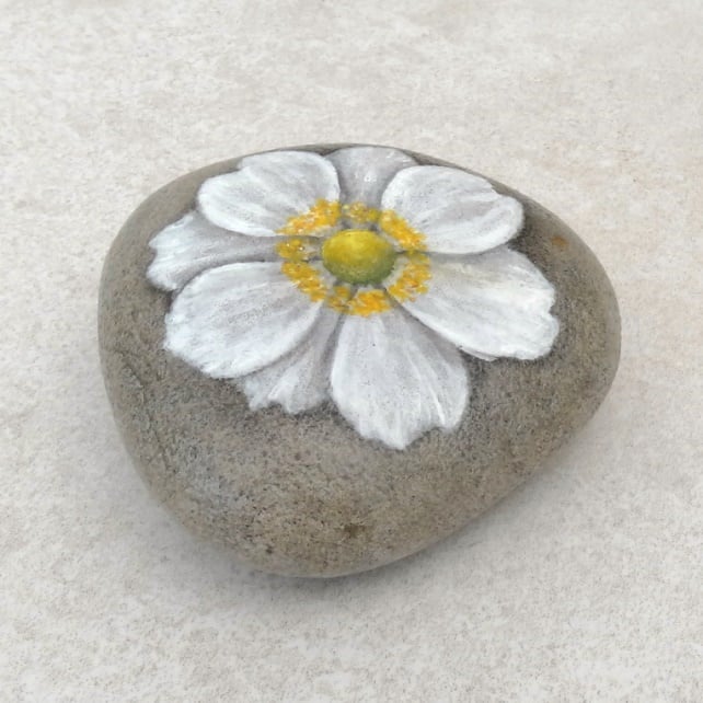My hand painted stone 'Japanese Anemone' stone has been painted in quality acrylic paints and finished with three coats of matt acrylic sealer which gives them a smooth tactile finish.