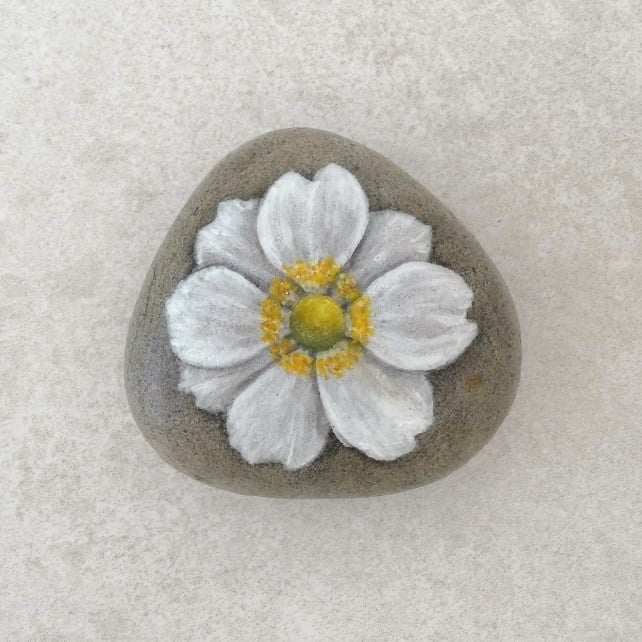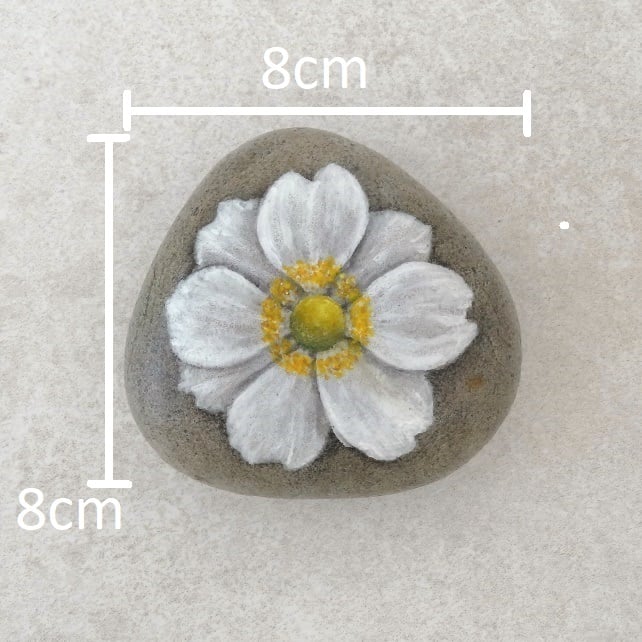 My hand painted stone 'Japanese Anemone' stone has been painted in quality acrylic paints and finished with three coats of matt acrylic sealer which gives them a smooth tactile finish.