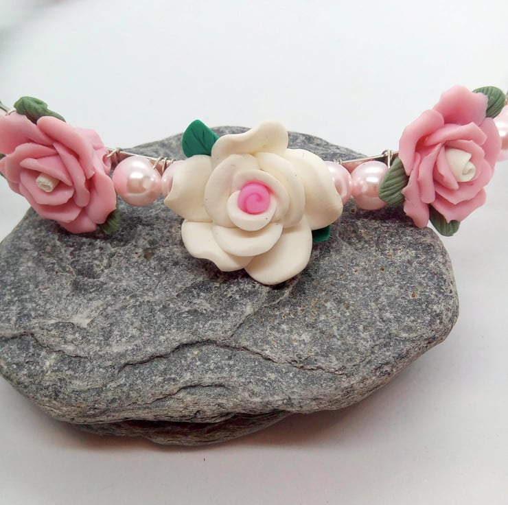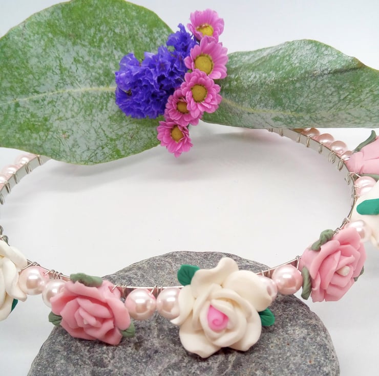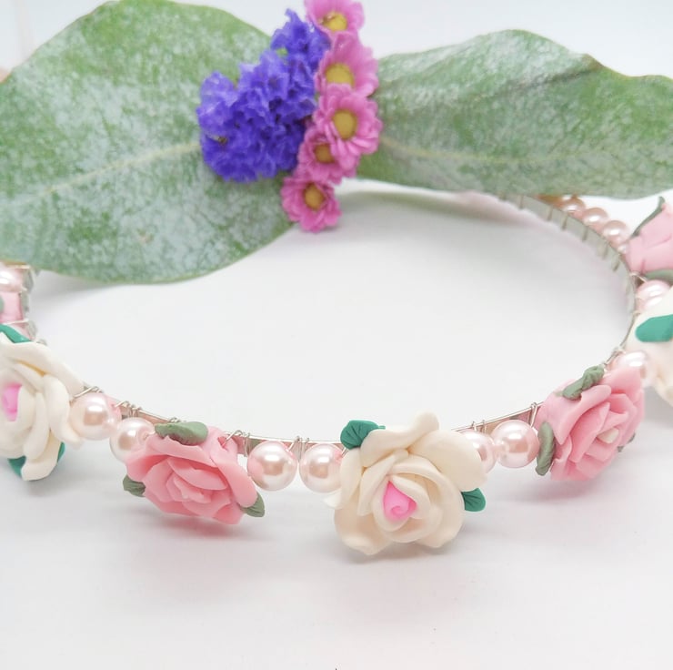 The head band is on a silver plated flexible base and has pink polymer clay roses measuring 20 mm x 20 mm and white polymer clay roses measuring 30 mm x 30 mm. The tiara base is decorated with 8 mm pink pearl beads.