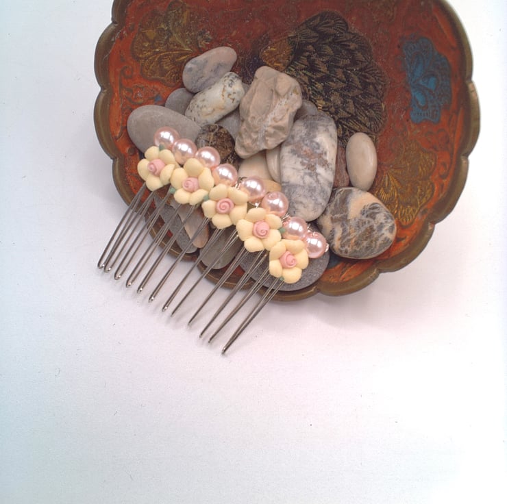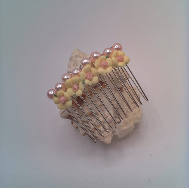 This pretty pearl and flower beaded hair comb would look great worn in your hair for any special occasion such as a wedding or a prom night. It would also make a great gift for a young lady for her prom night, or for a bridesmaid or flower girl on your special day. It has 5 polymer clay flowers measuring 10 mm x 10 mm and 8 x 6 mm pale pink pearl beads all attached to the silver plated comb base using silver plated wire. The comb base measures 50 mm x 40 mm. If you require your hair comb in any other colour combination then please contact me to discuss further. Most colours would be available. Each hair comb will be dispatched wrapped in tissue paper in a presentation box and delivered to you via Royal Mail first class post.