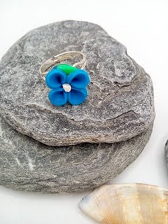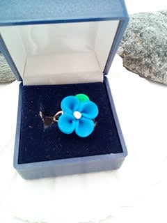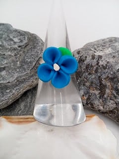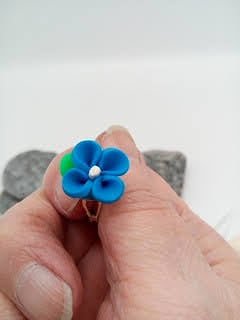 The ring base is adjustable so will fit most sized fingers and it has a 15 mm x 15 mm blue flower with a green leaf.