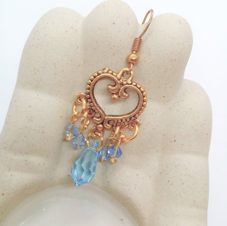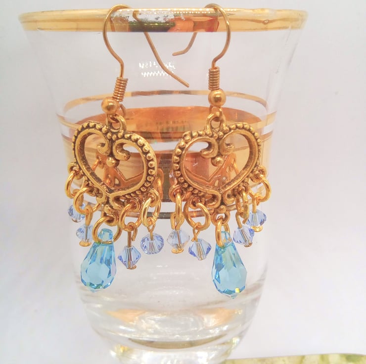 The earrings are made using 3 mm pale blue crystal bicone beads and a 15 mm x 8 mm turquoise coloured teardrop crystal bead all on a gold plated heart connector hung on gold plated ear hooks and they have a drop of 3.8 cm.