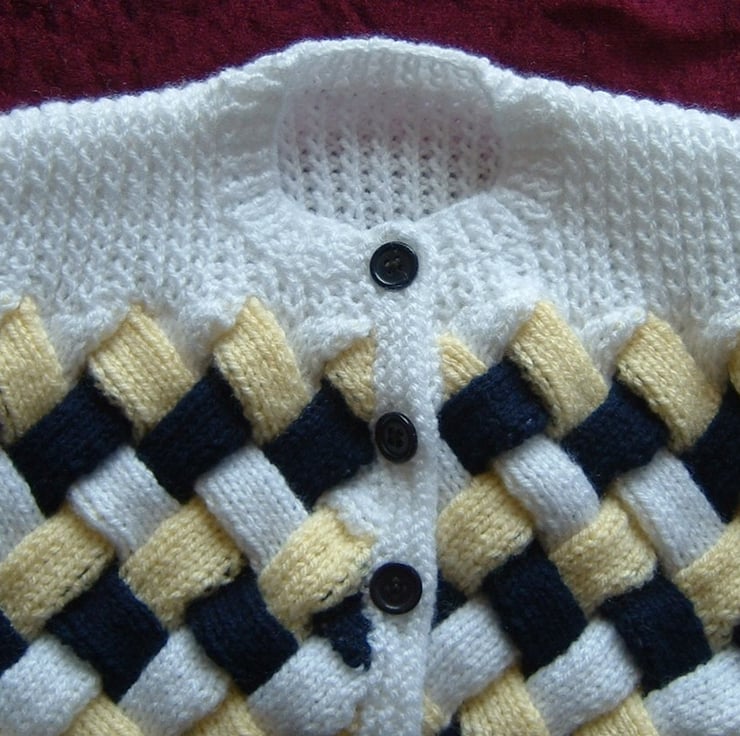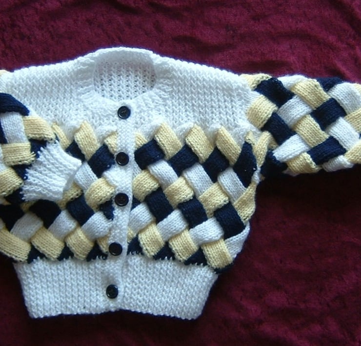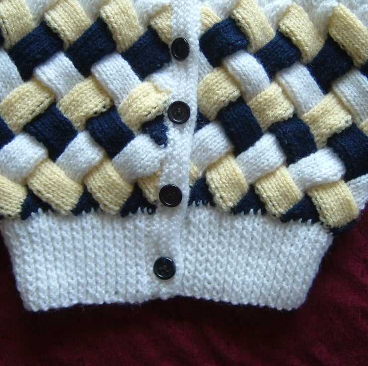 this beautiful baby cardigan has been hand knitted using quality acrylic yarn. In three colours, white, navy and yellow.