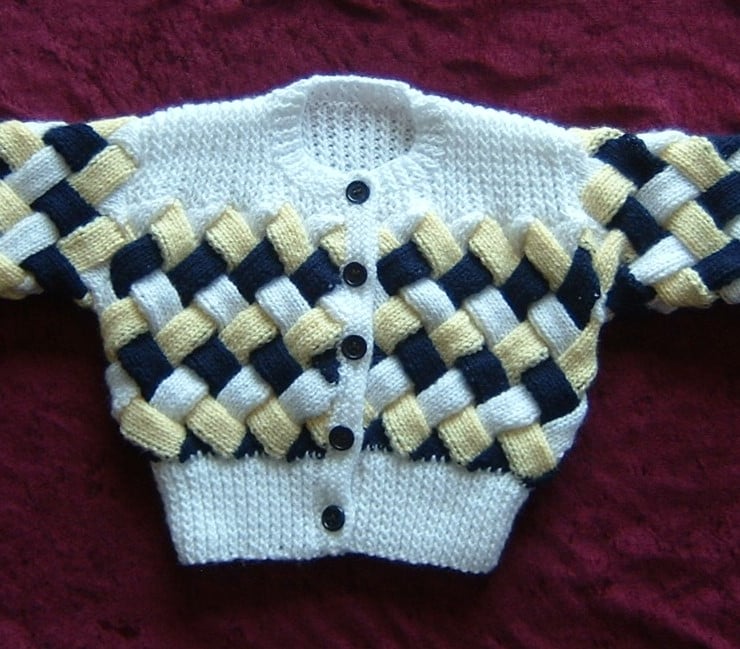 Knitted in the entrelac pattern it will fit a baby of approximately 1-2 years.