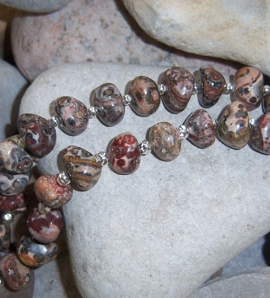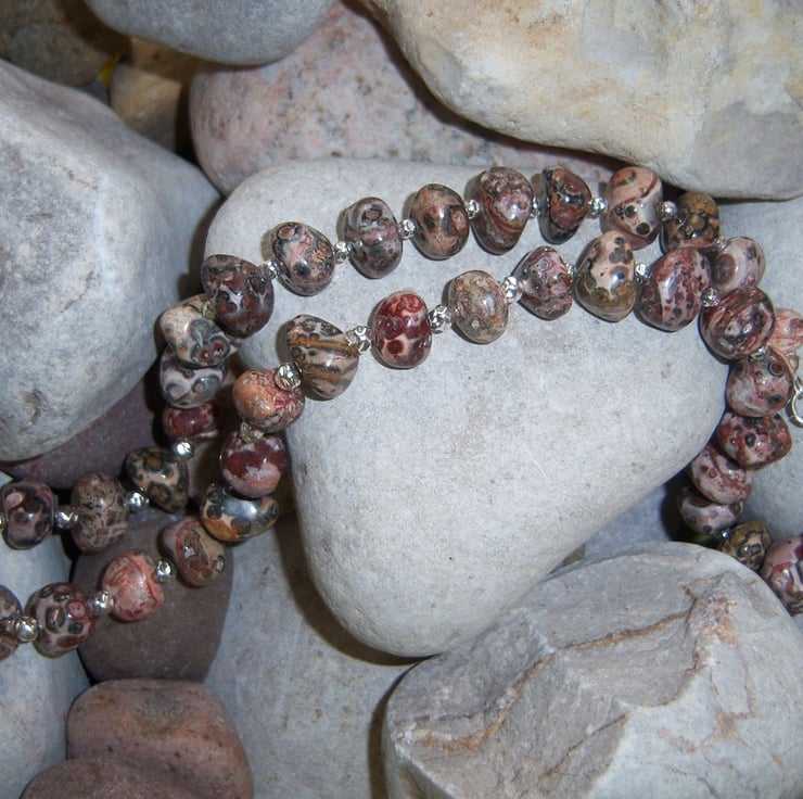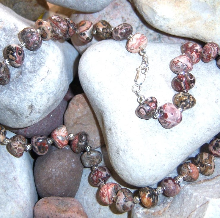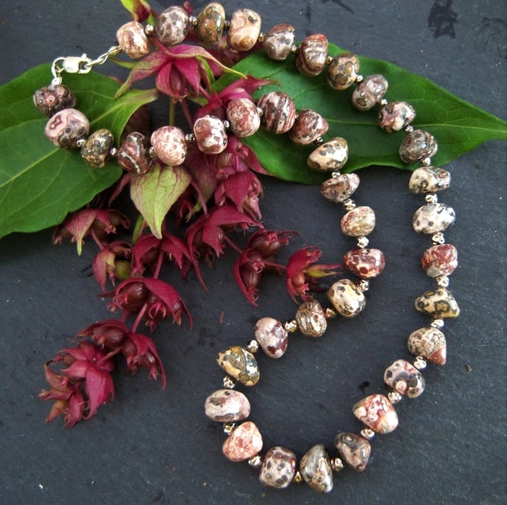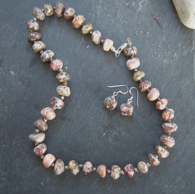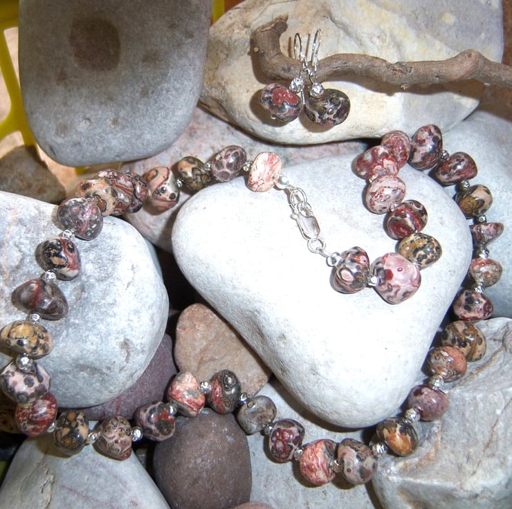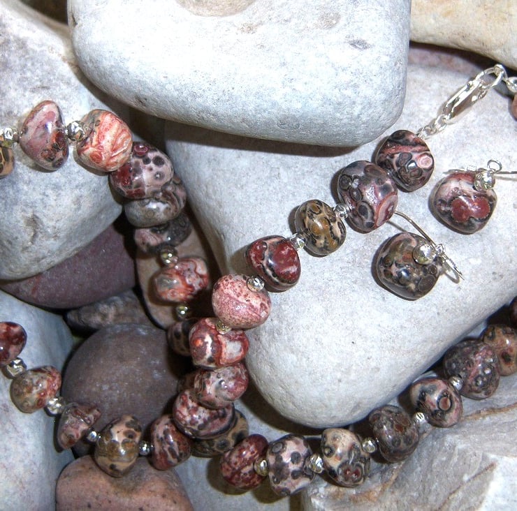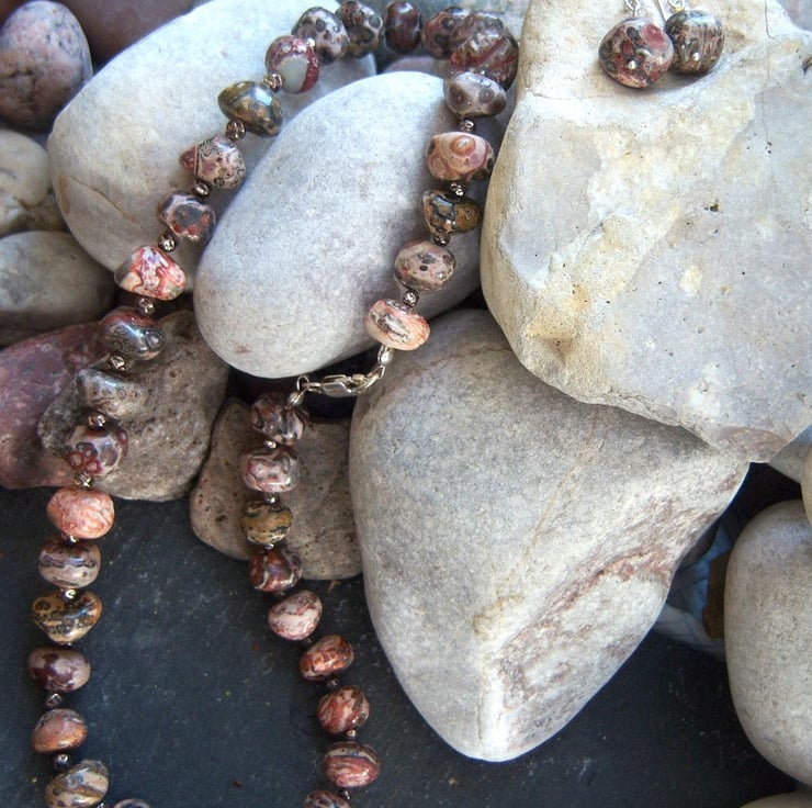Necklace and earrings made up of leopardskin jasper gemstones - knobbly irregular nugget/pebble shape type. (Also known as jaguar stone.)