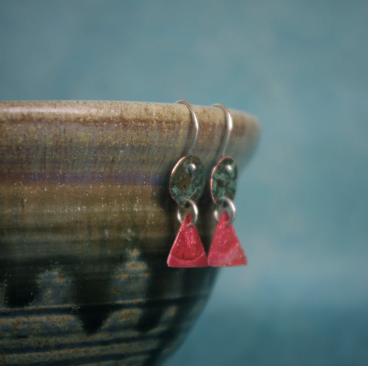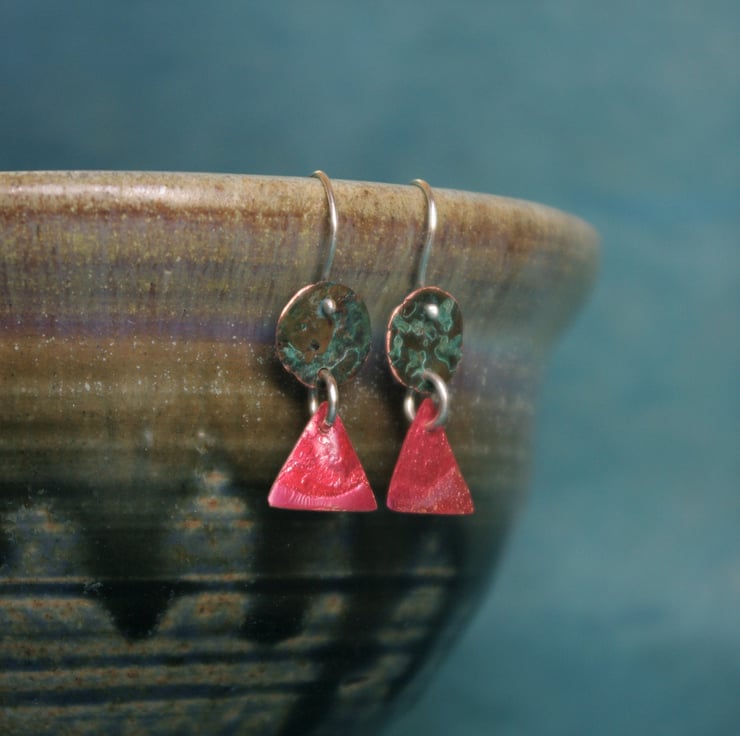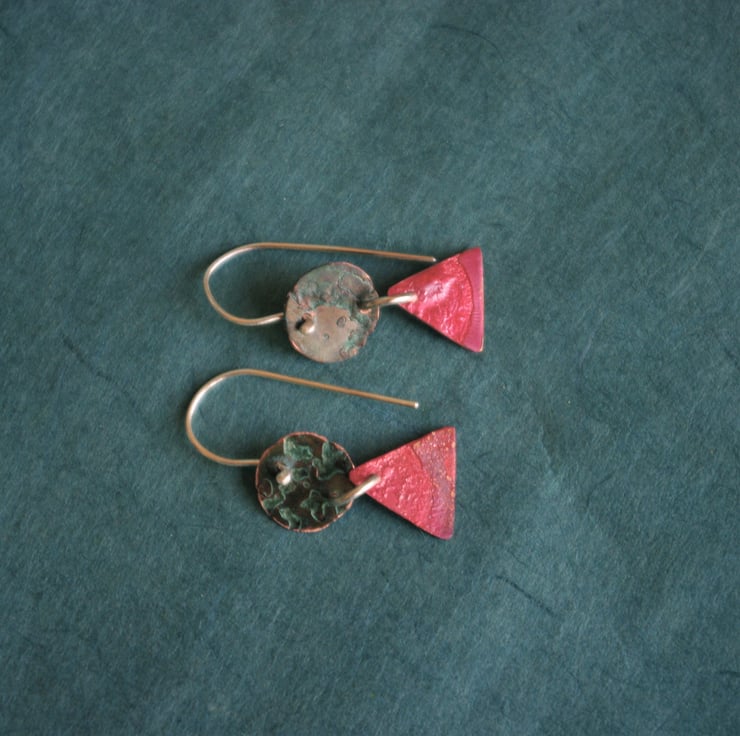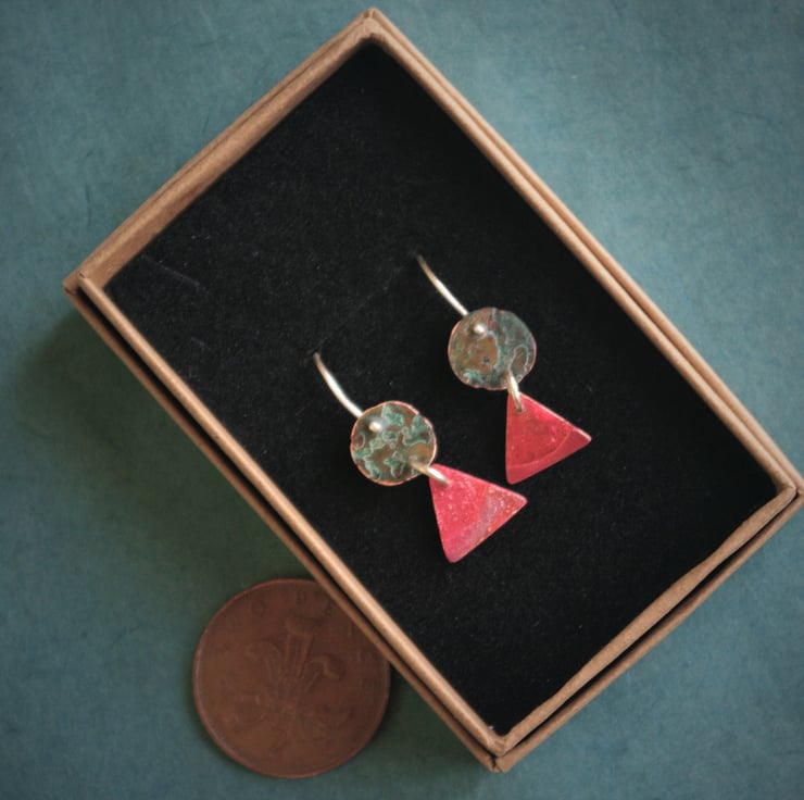 I have used patination techniques to produce interesting shades of dark green with flecks of blue-green and a very textured surface on circles of copper. The triangles have gained luscious shades of red after heating and a process of reticulation which gives the surface a rippled texture.They are joined together with sterling silver rings, which picks up the blob of silver on the end of the earhook . The verdigris is preserved with a coat of matt sealing lacquer.