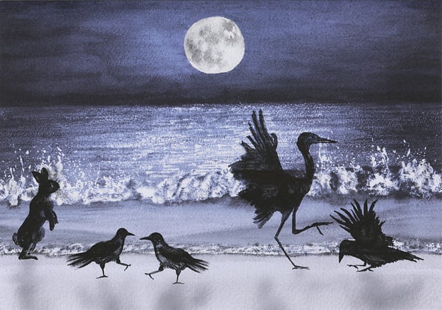 This illustration, originally created for the joyful final chapter of my children's book "The Tree with a Golden Heart", has proved to be one of my most popular images to date :-) The animals and birds gather together on the beach for a special celebration by the light of the full moon, and dance all night on the pale sand while the waves splash merrily behind them.