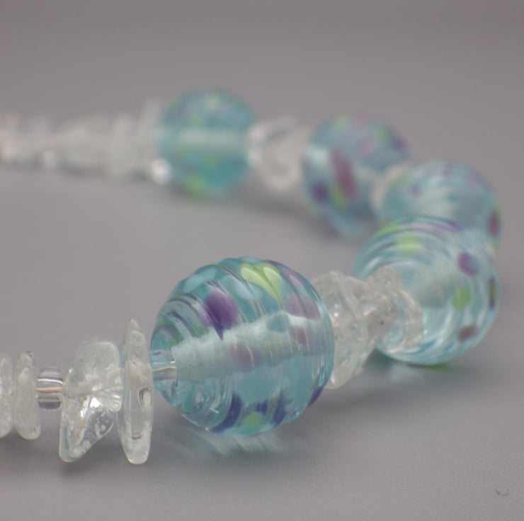 Brrr! This necklace has been made with cool clear round ribbed lampwork beads, decorated with green, blue and purple frit (glass chips) during their manufacture. They have been teamed with chips of blue topaz and clear colourless seed beads to create a necklace that evokes an icy wintry day. The beads are strung on Beadalon wire, which is a group of stainless steel wires twisted together and coated in nylon, giving a strong and durable result. The necklace is finished with Sterling Silver findings, including a secure lobster clasp.