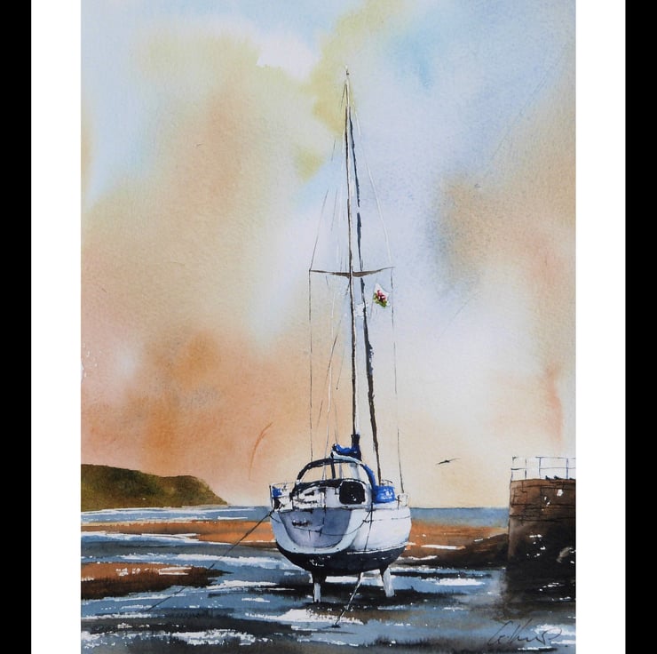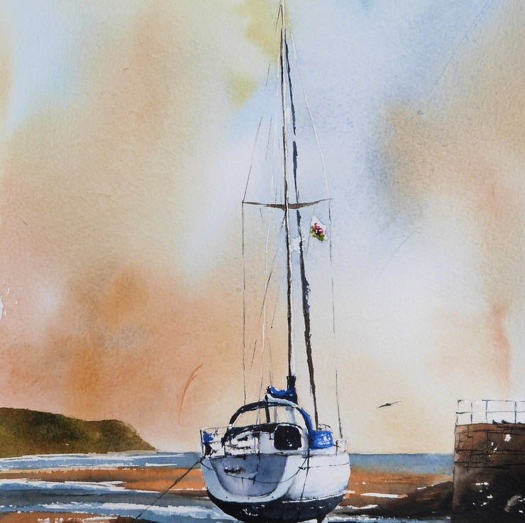 My paintings are inspired by places, memories and feelings. This particular painting was inspired by my love of the coast and sailing. It is painted from a photo I took on an early morning walk on Abersoch beach, North Wales.